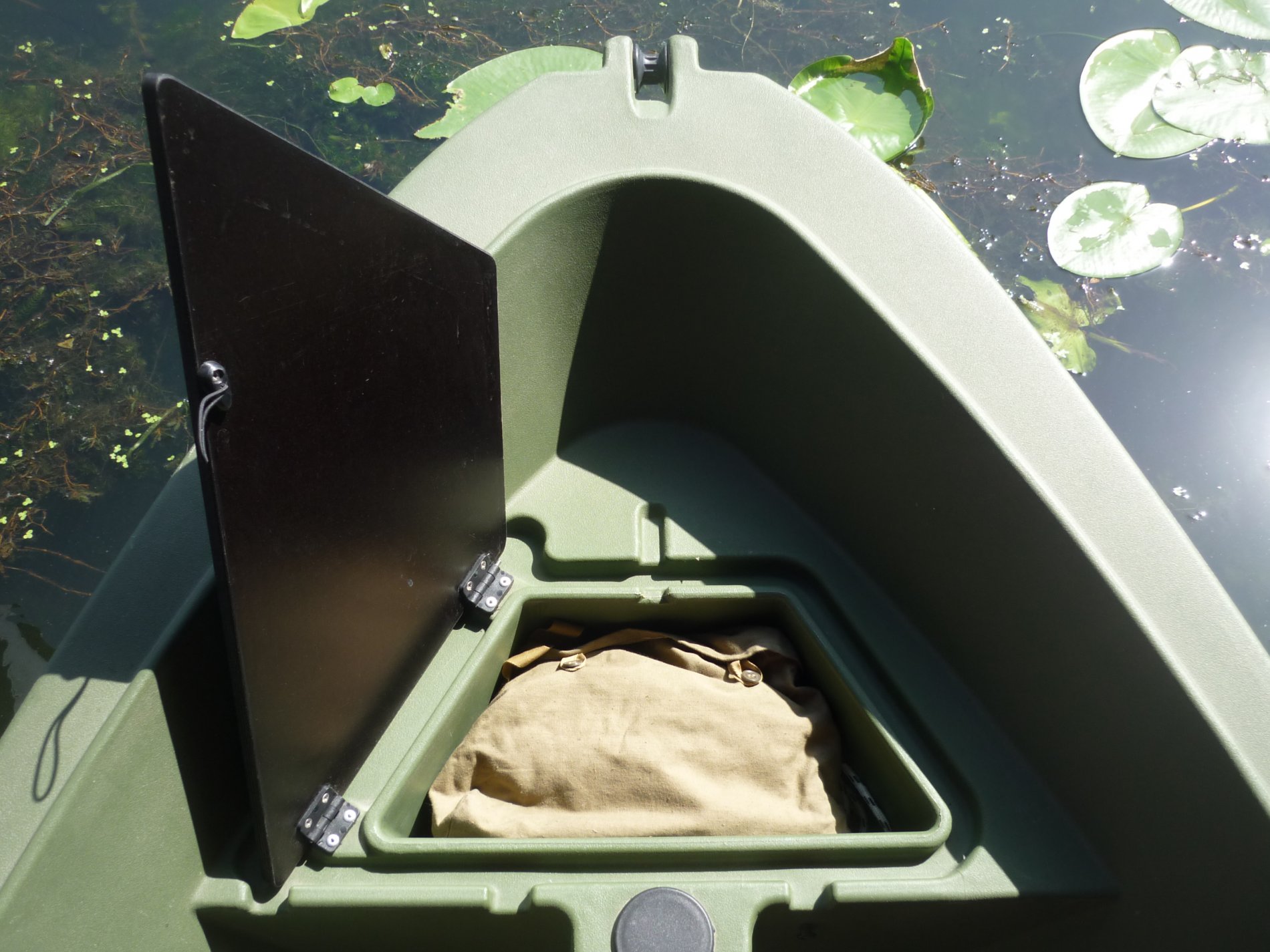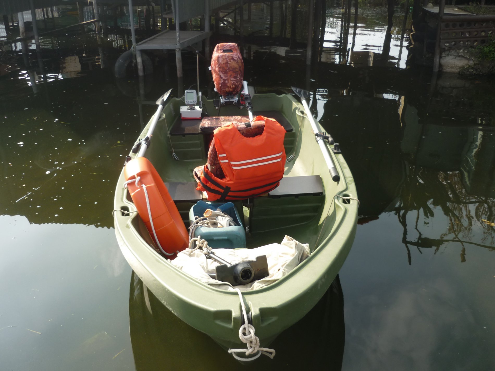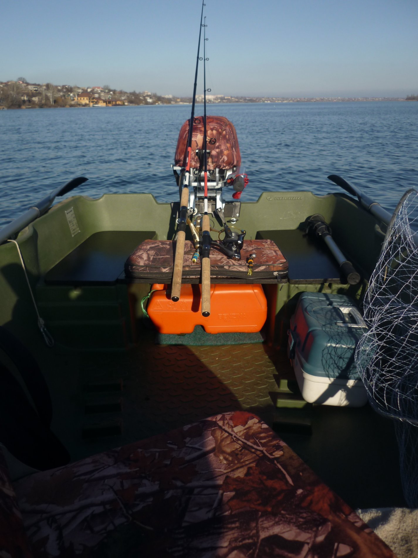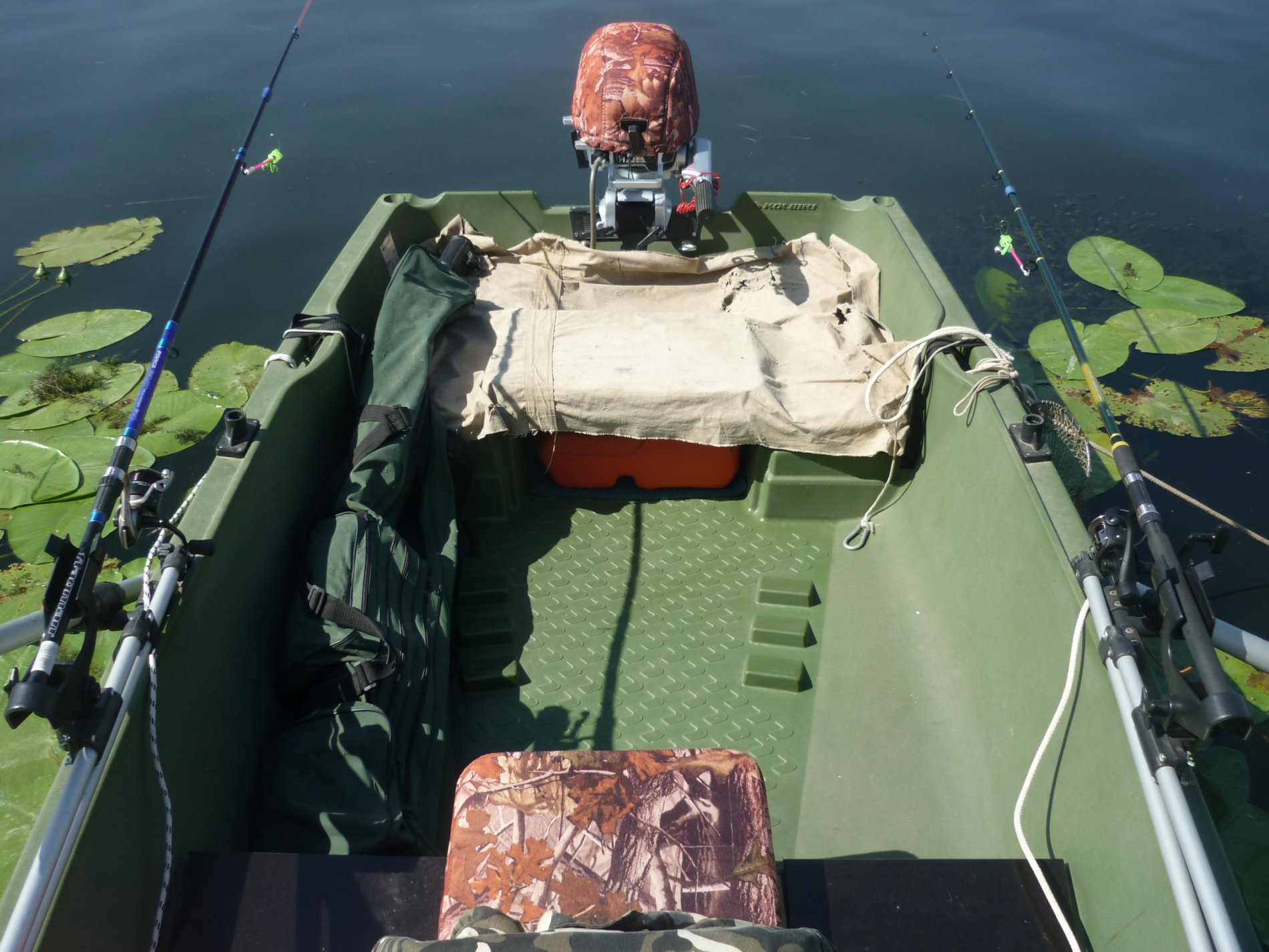 Всех приветствую! 2 года назад перед покупкой лодки RKM-350 информации о ней было ограничено, а реальных отзывов вообще не было. Предлагаю мой вариант по обустройству лодки, возможно кому-то пригодится. В кокпите имеется 5 сухих рундуков( 2 на задней, 2 на средней, 1 носовой банке). В левом заднем я разместил огнетушитель, аптечку и другие предметы первой необходимости. В правом заднем - вещи( от весны до осени).В левом рундуке на средней банке - принадлежности для рыбалки. В правом - документы. ЗИП для мотора, катушки и.т.д. В носовом рундуке тоже храню вещи. По опыту после дождя всё в рундуках сухое. Для хранения якорей приспособил старую полиэтиленовую канистру, срезав боковую часть.Туда вмещается 100 метров каната и 2 якоря. Основной якорь Холла-15Lb(7.5кг) - держит лодку на любой волне и ветре.Также в носовом отсеке разместил справа спасательный круг и жилет.Для управления со средней банки использую телескопический удлинитель румпеля. В зависимости от волнения управляю мотором со средней или задней банки.Дисплей эхолота и навигатор разместил на пластиковом боксе, который при необходимости можно перемещать в любое место лодки, а хранить в рундуке.Держатели для удилищ установил для разных условий ловли( с левого.правого борта.с кормы под тентом и без тента) На средней банке установил поворотное кресло, которое всегда можно снять. Всё видно на фото.