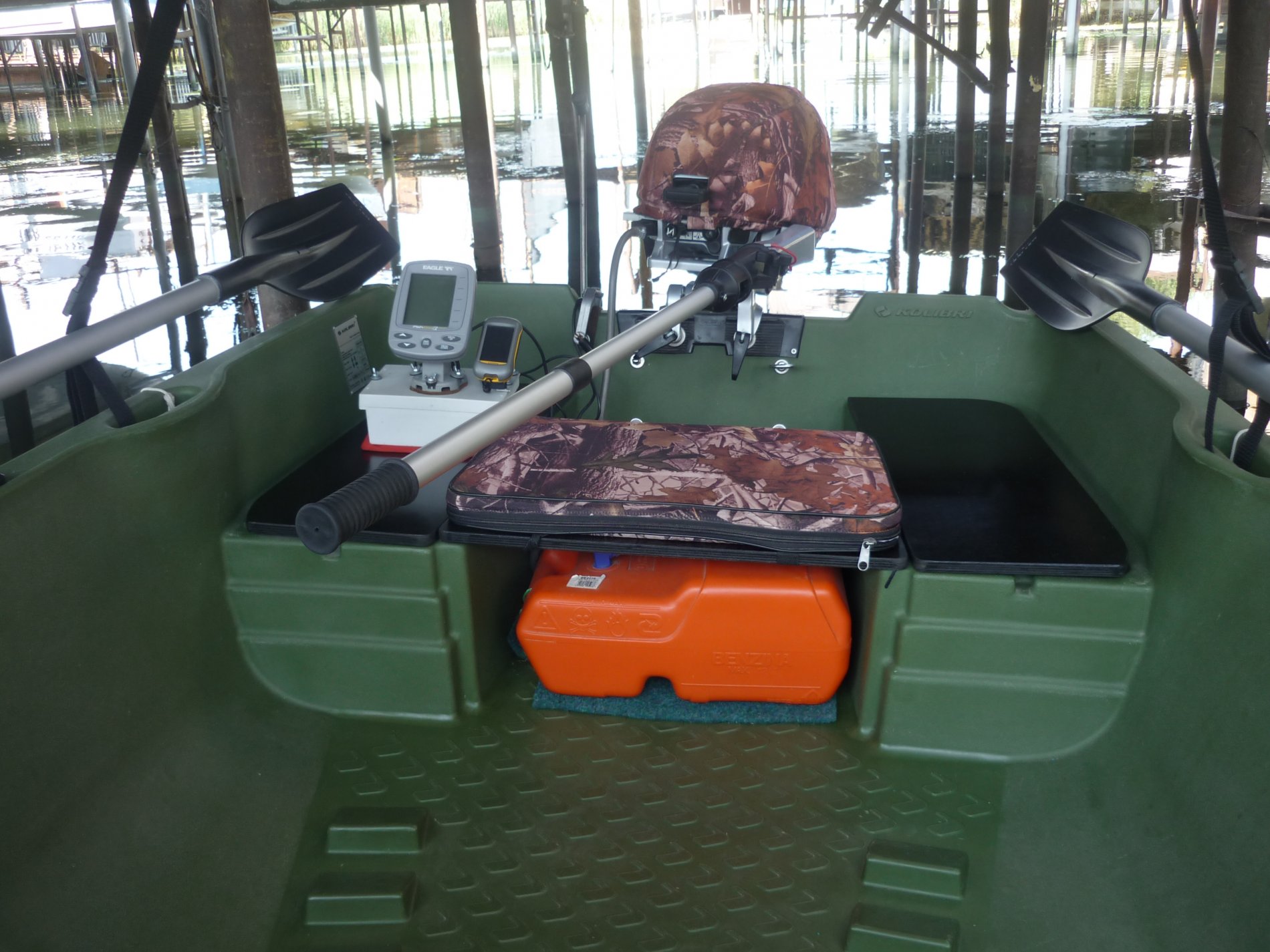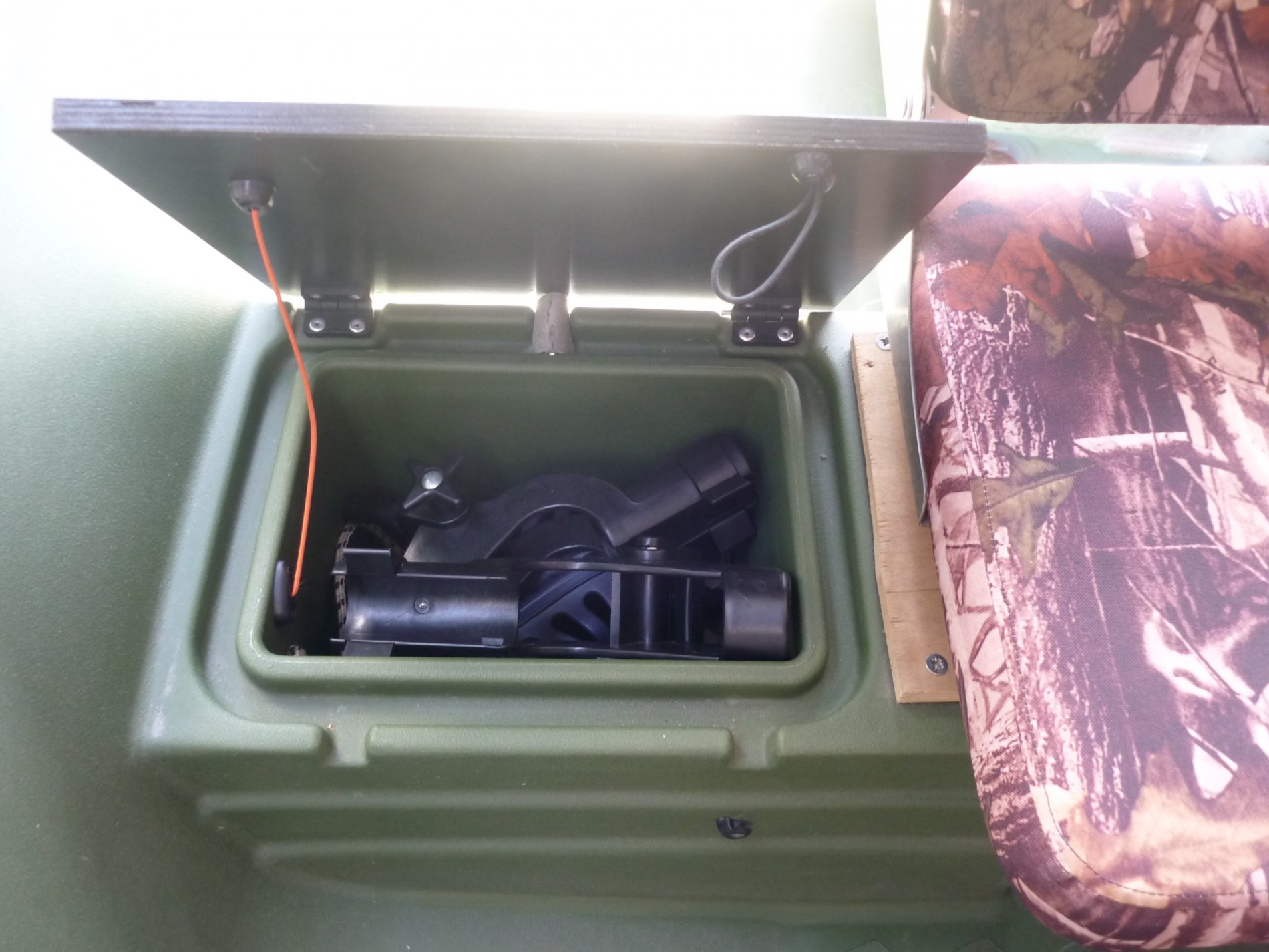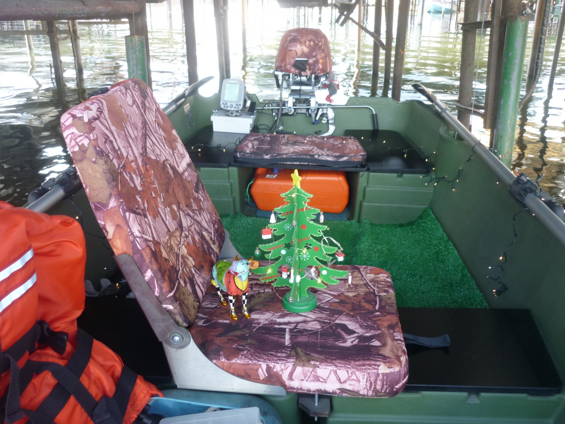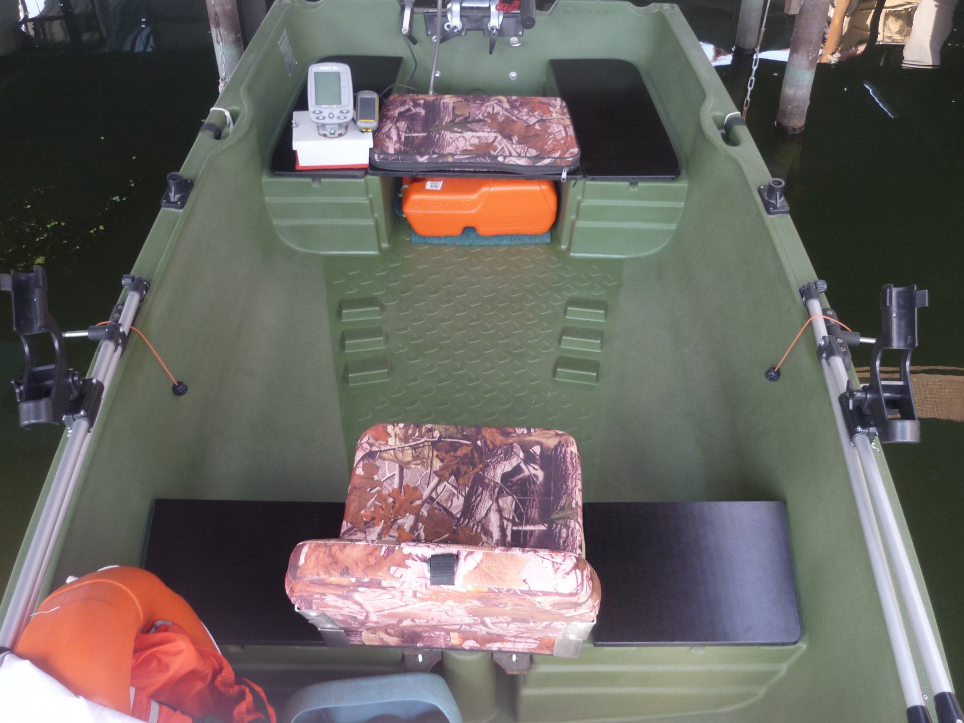 Всех приветствую! 2 года назад перед покупкой лодки RKM-350 информации о ней было ограничено, а реальных отзывов вообще не было. Предлагаю мой вариант по обустройству лодки, возможно кому-то пригодится. В кокпите имеется 5 сухих рундуков( 2 на задней, 2 на средней, 1 носовой банке). В левом заднем я разместил огнетушитель, аптечку и другие предметы первой необходимости. В правом заднем - вещи( от весны до осени).В левом рундуке на средней банке - принадлежности для рыбалки. В правом - документы. ЗИП для мотора, катушки и.т.д. В носовом рундуке тоже храню вещи. По опыту после дождя всё в рундуках сухое. Для хранения якорей приспособил старую полиэтиленовую канистру, срезав боковую часть.Туда вмещается 100 метров каната и 2 якоря. Основной якорь Холла-15Lb(7.5кг) - держит лодку на любой волне и ветре.Также в носовом отсеке разместил справа спасательный круг и жилет.Для управления со средней банки использую телескопический удлинитель румпеля. В зависимости от волнения управляю мотором со средней или задней банки.Дисплей эхолота и навигатор разместил на пластиковом боксе, который при необходимости можно перемещать в любое место лодки, а хранить в рундуке.Держатели для удилищ установил для разных условий ловли( с левого.правого борта.с кормы под тентом и без тента) На средней банке установил поворотное кресло, которое всегда можно снять. Всё видно на фото.