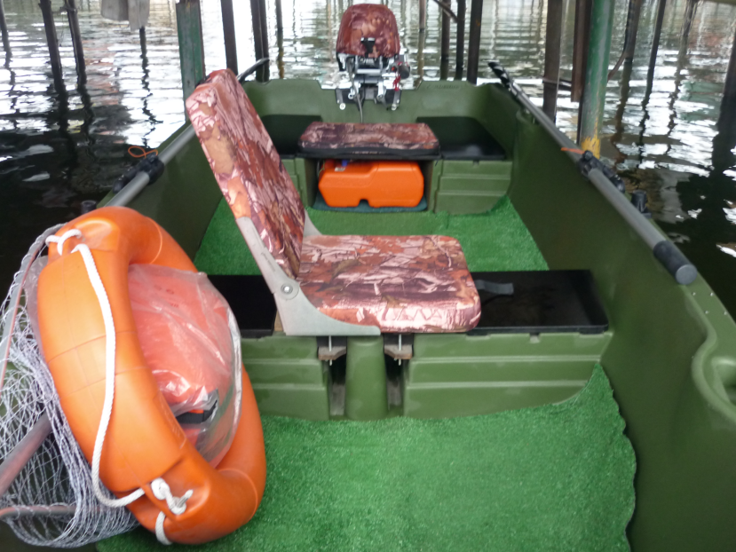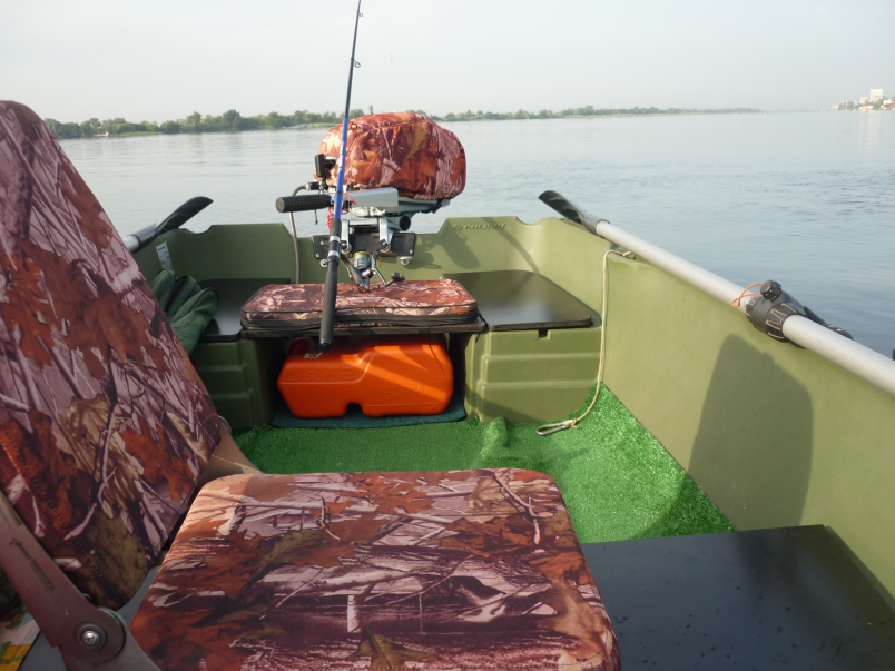 Много уже сказано о лодке выше, но хочется отметить самое главное её достоинство - это безопасность. За 5 лет при грамотном управлении лодкой, как с мотором, так и без него лодку ни разу не заливало водой и за счёт материала - полиэтилена, из которого она изготовлена - на воде лодка как поплавок, моментально отыгрывает любую волну и материал хорошо гасит удары . Очень легко идёт под вёслами, если нет мотора и небольшие расстояния, то для этих условий отличный вариант. Лодка имеет 5 встроенных рундуков, поэтому с хранением вещей проблем нет и они всегда сухие. Все доработки, сделанные на лодки выше постами и крайнее, что сделал, так это постелил на пол ковровое покрытие для наружного применения - мягко и комфортно и после рыбалки можно вытряхнуть остатки корма в воду.