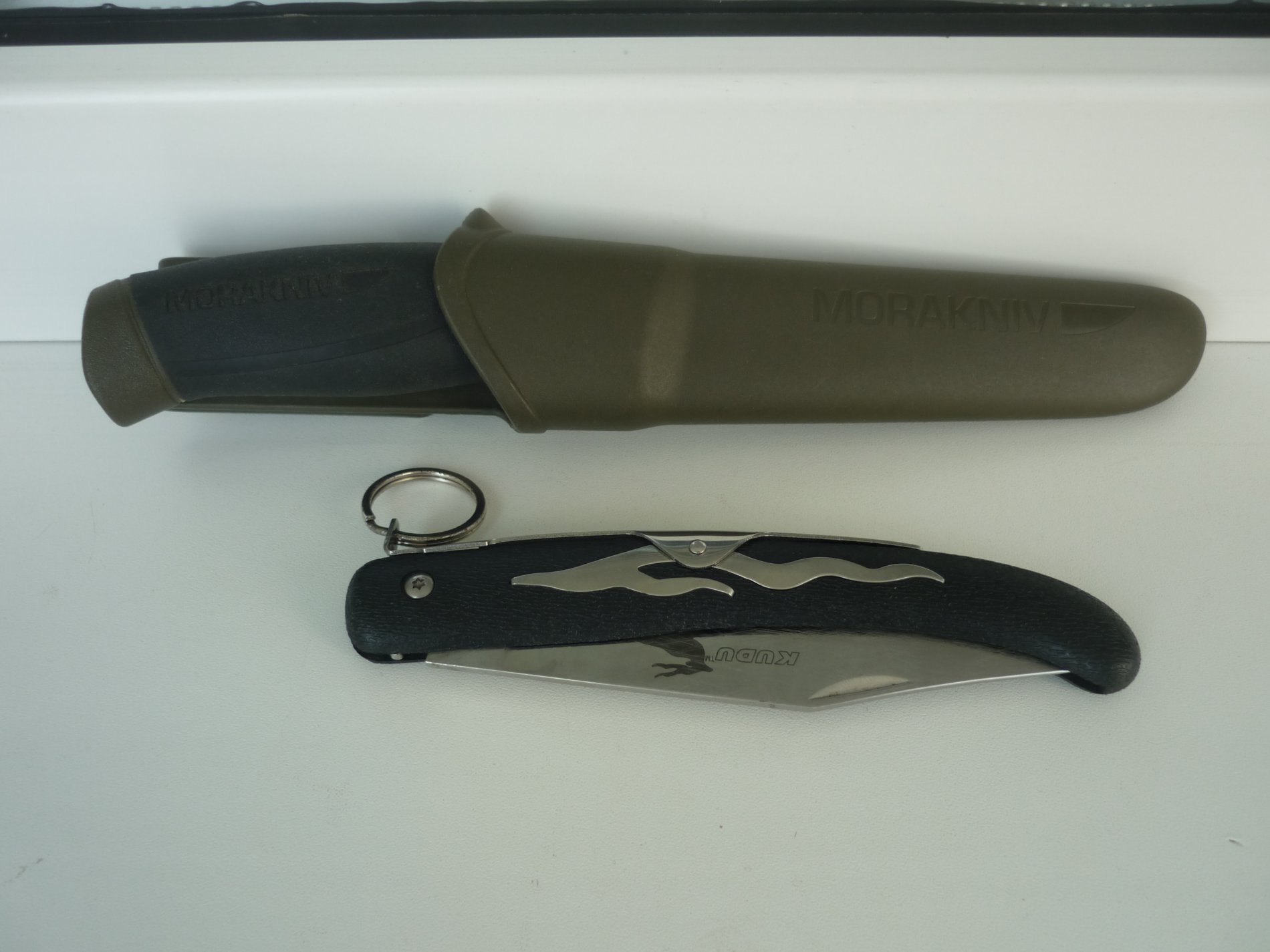 В рюкзаке, который всегда со мной и в лодке и на велосипеде держу раскладной нож Cold Steel Kudu - фирма США, производство Китай - тоже бюджетный , до 10$,изготовлен из стали 4116 Krupp (немецкая недорогая нержавейка) длина клинка - 108мм.,общая - 250мм., вес - 70гр. Рукоятка литая,сверху кольцо для отжатия и разблокировки клинка. Покупался 10 лет назад, лёгкий, длинный клинок - используется для задач кухни. Сталь мягкая - быстро тупится, но и быстро правится, довёл его на бруске до состояния бритвы.