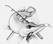 1. Суть композиции: пожалуй, наиболее распространенный хищный трофей (щука) обвивает наиболее распространенные рыбацкие аксессуары: спин и подсак. Так что это, по моей задумке лучше оставить;