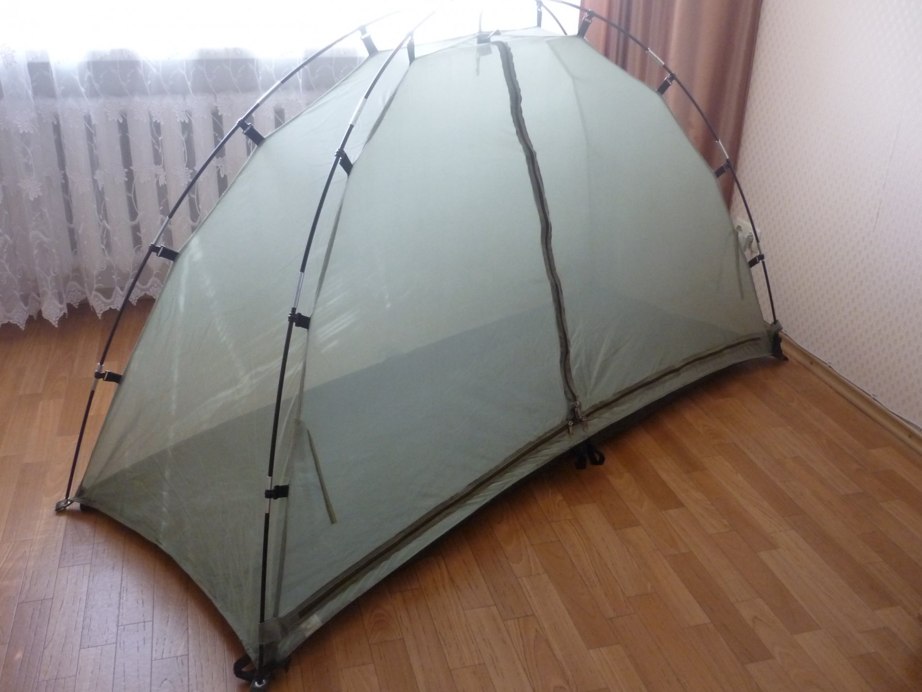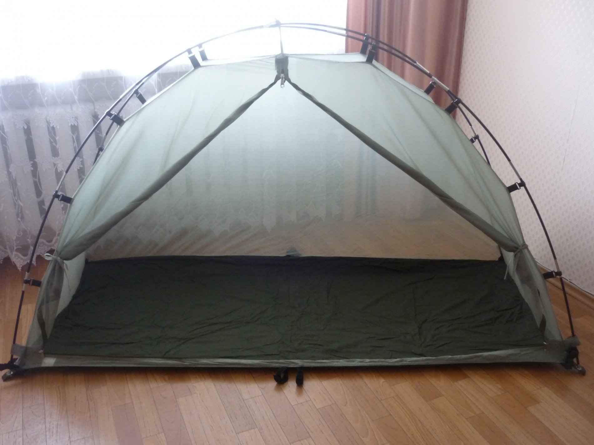 Это отдельная палатка, которая может располагаться как на поверхности, причём устойчиво стоит, так и у неё имеется 12 креплений на раскладушку. За счёт универсальности креплений её можно использовать в разных условиях.Качество изготовления понравилось. Размеры внутренние - длина - 1м80см., ширина - 75см, высота - 1м05см. Дно выполнено из толстой х/б ткани. Передняя стенка расстёгивается посередине и полностью внизу, по бокам имеются подвязки. Сверху на куполе имеется крючок для подвешивания. Собрал за 5 минут, компактная - всё собирается в небольшой чехол. Вес - около 1500 гр.