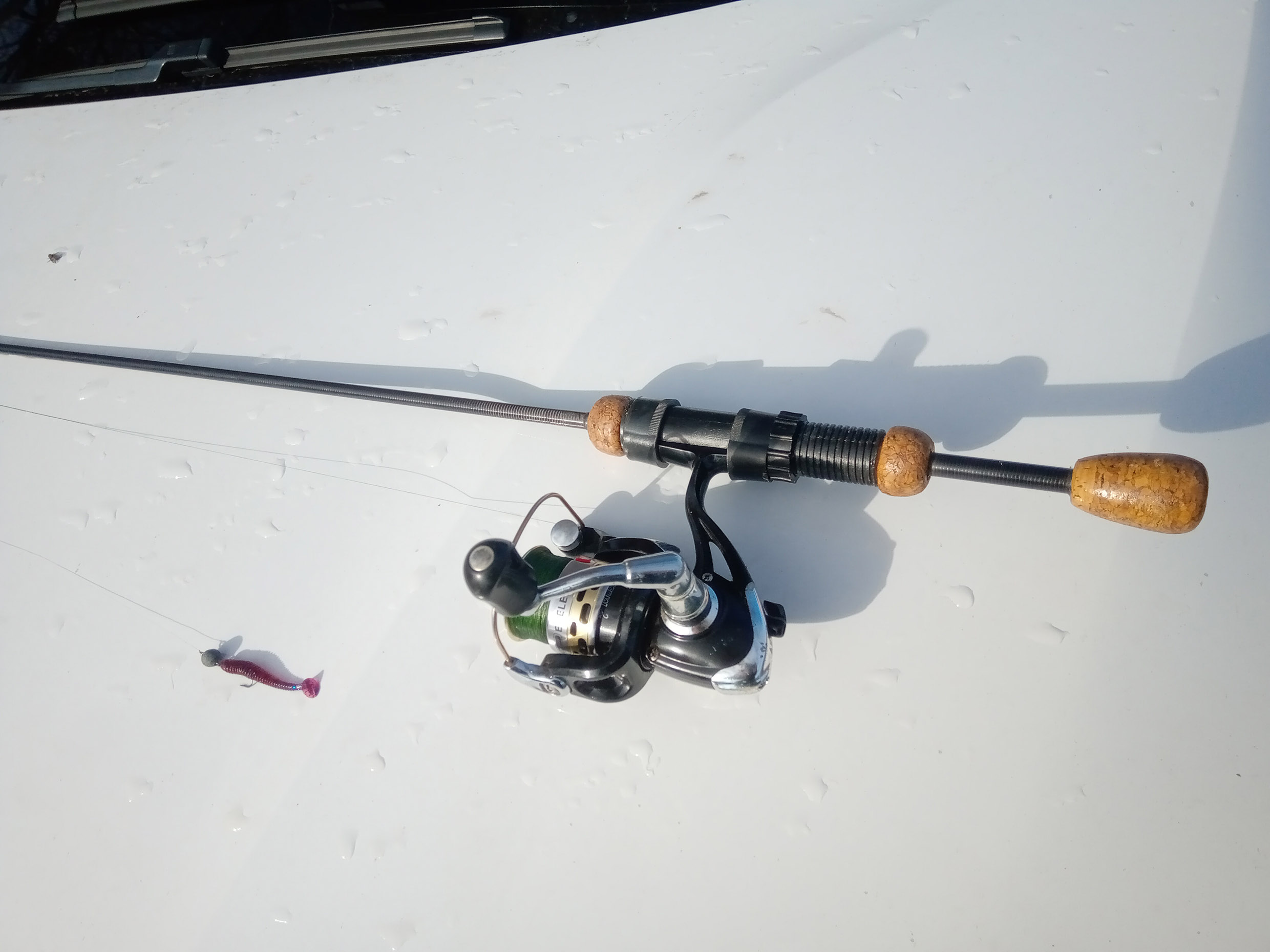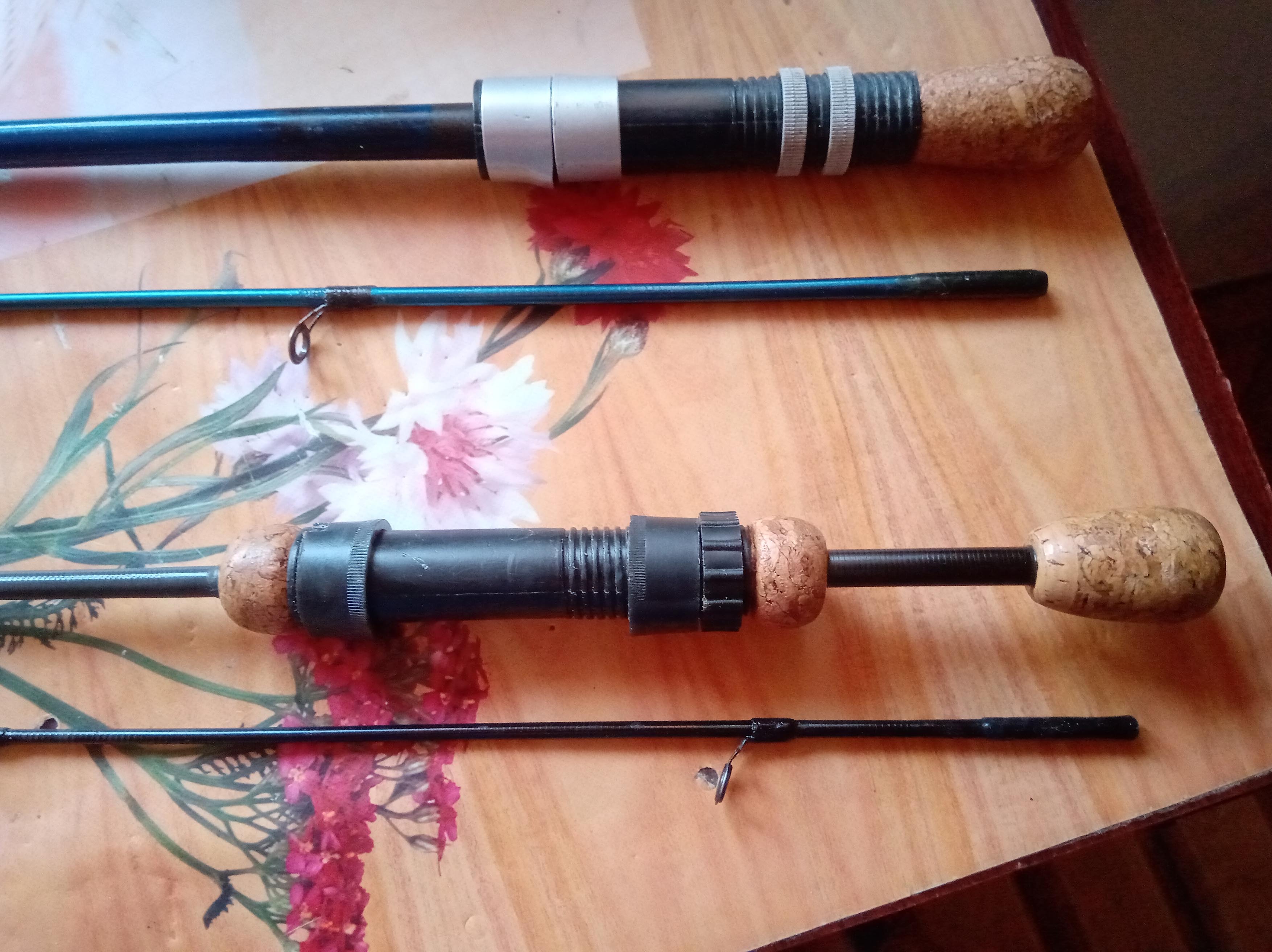 Спасибо. Добавлю, что я его не делал по размерам самодельщиков с Ютуба. Ведь первый я сделал когда наверное еще ни кто не делал. А пользовались для мормышинга какими то форелевыми палочками. Мои в росте 2 метра. Покупал я три прутика. Первое и второе колено от карбоновой маховой удочки и самый тонкий карбоновый хлыстик, который предназначен якобы для зимних безмотылок. В комеле, где ручка, еще кусочек от 3-го обломанно колена. Катушкодержатели снял с совдеповских стеклянных спиннингов. Хотя красивее будет если снять с какой то зимней удочки. Задний хвостик с пробкой сделал для красоты. После испытаний понял, что он лишний. Удобней как в первом, ручка как у шпаги.