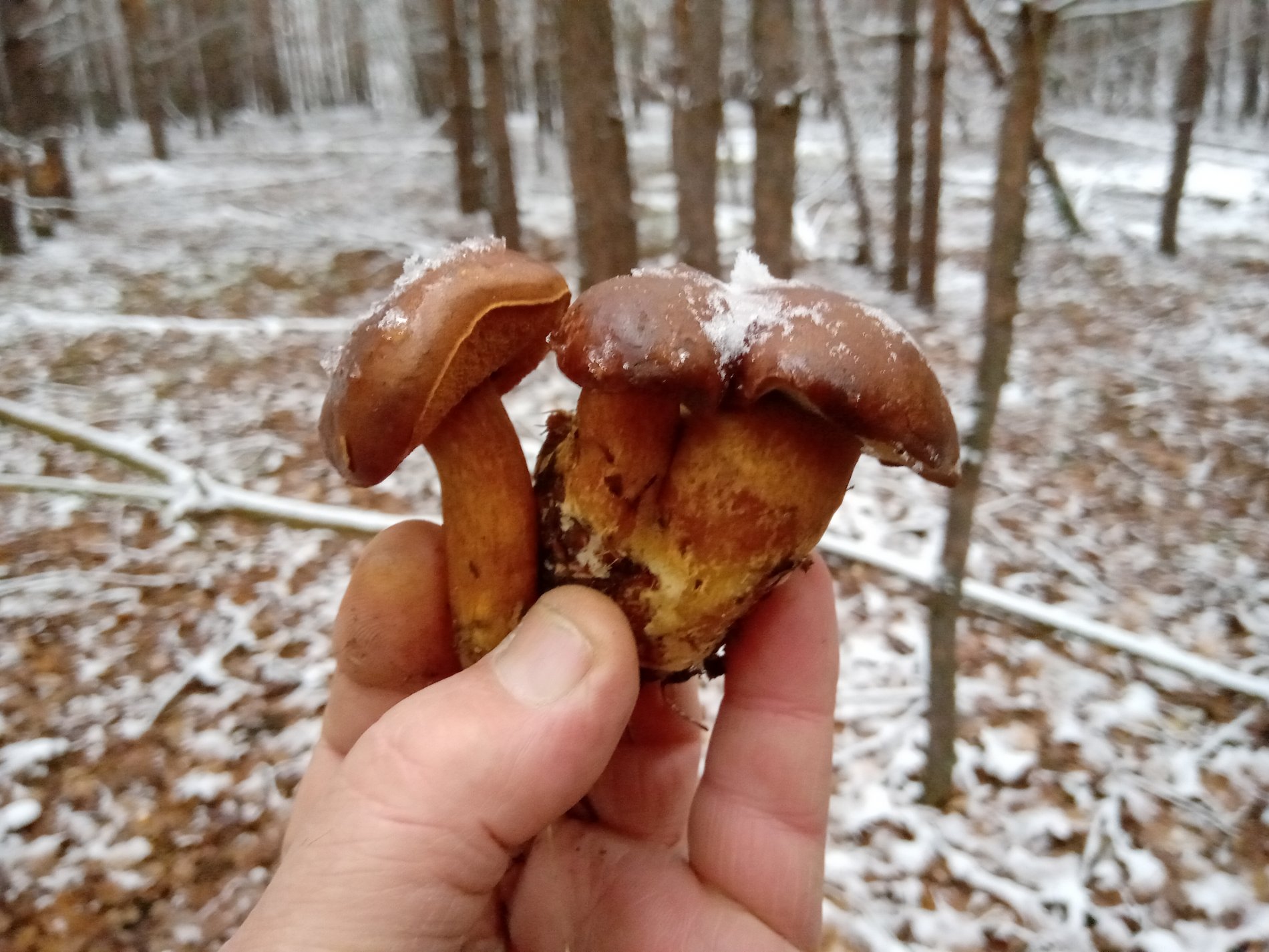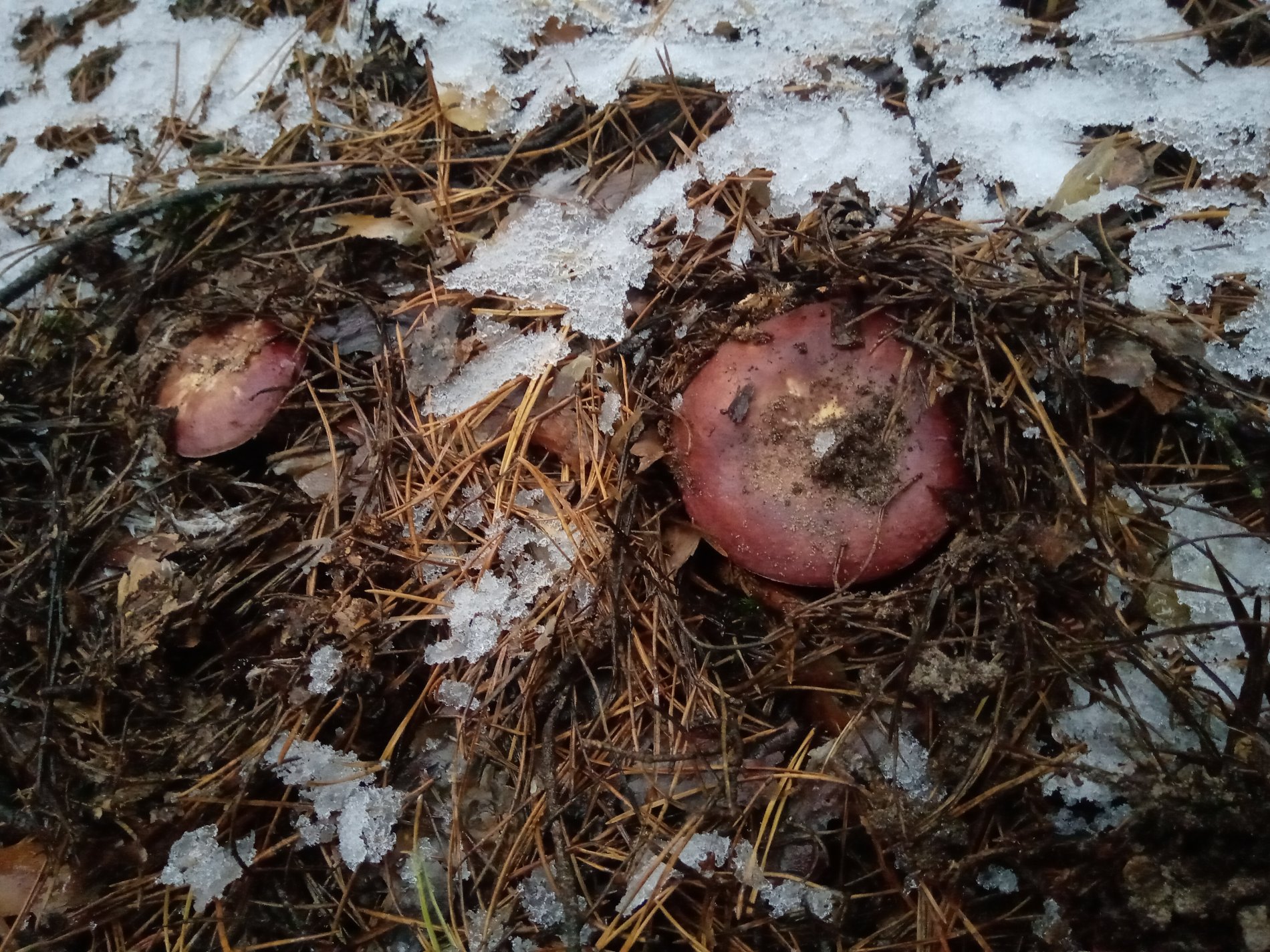 2 декабря, после рыбалки осталось пару часов пока стемнеет. По лесной дороге остановились поискать грибы подснежники, и нашли. Немного польских и целый пакет сыроежек. Поляки торчали из под снега а сыроежки надо было раскапывать бугорки в хвое. В субботу можно брать грабельки и на грибалку за сыроежками.