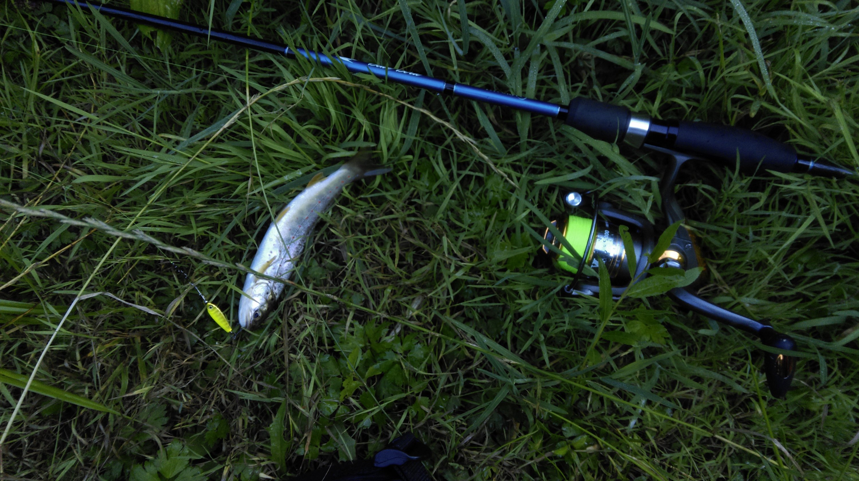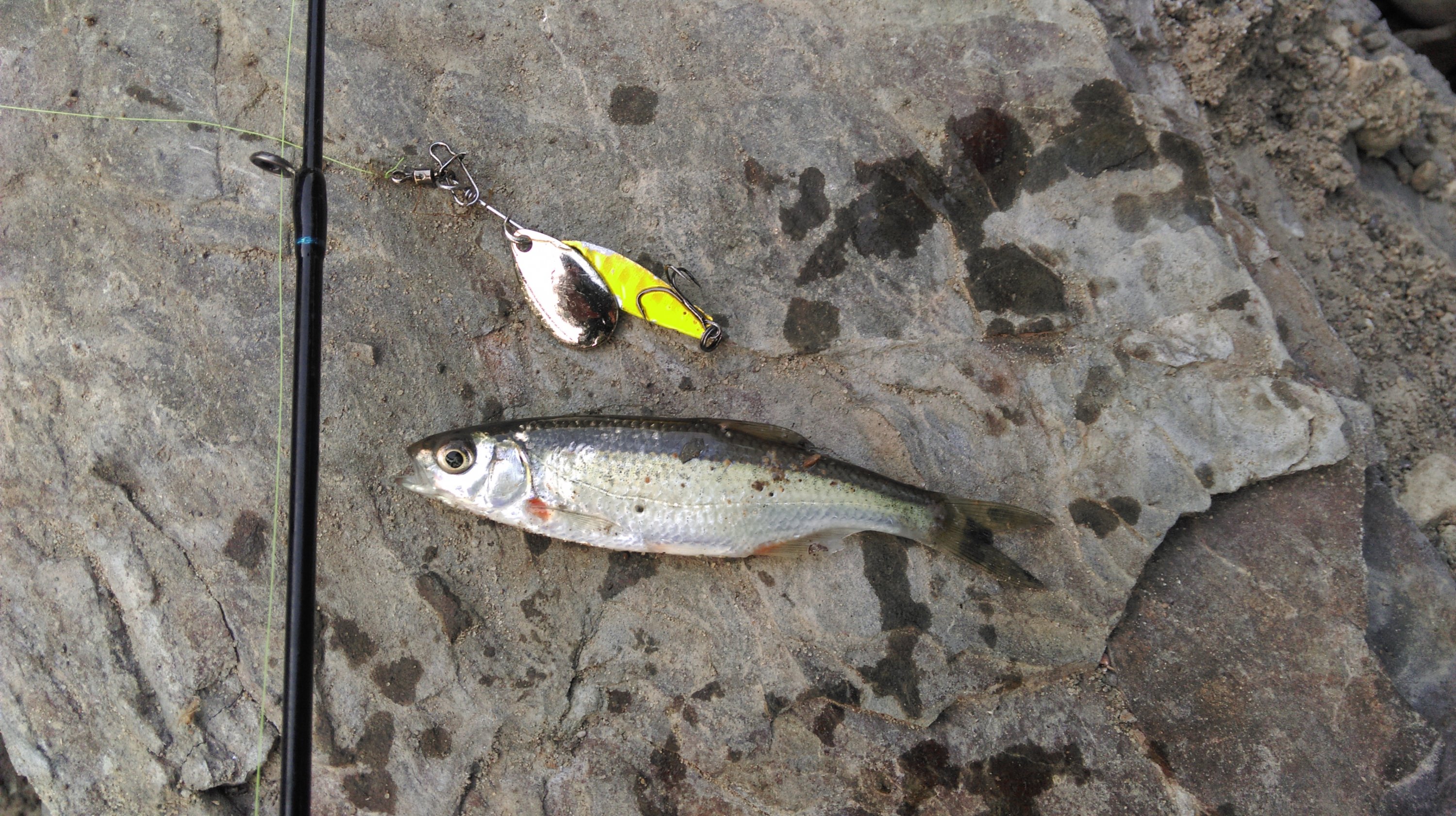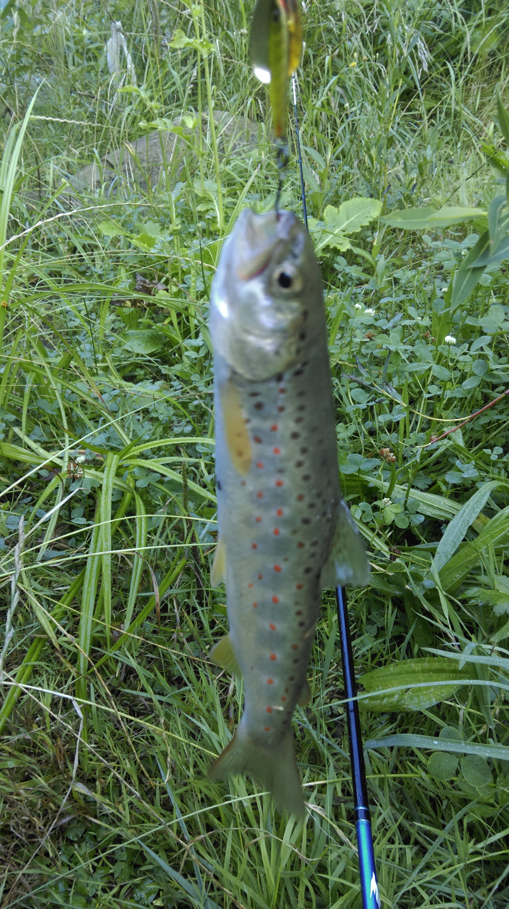 Вращающиеся блесны разловил, хотя местные ходят с силиконом и воблерами. Итого пару форелей, небольших голавликов взял, было два схода голавля в прыжке, взял на падении блесну и умудрился сойти после резкого скачка.
