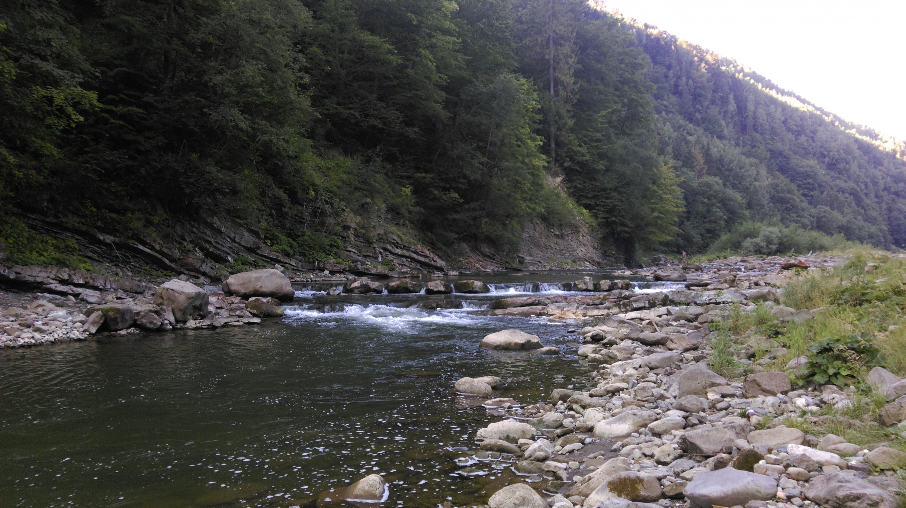 Особенности ловли: часто приходится делать боковые забросы из-за свисающих над водой веткок прибрежных деревьев, дальние точные забросы под противоположный берег достаточно результативны. Зацепы за камни и коряги легко устраняются на небольшой глубине где относительно слабое течение, подойти к центру реки глубиной даже пол метра но с сильным течением очень сложно без какой-то опоры (шест, палка) в руках, отойдя в противоположную сторону от зацепа крючек легко освобождается при зацепе за камень. Большинство поклевок было в самых неожиданных местах, где глубина была до полу метра. Крупную форель не видел, говорят ее больше в местах выше Яремче по течению, за водопадами, куда мелочь не в состоянии пройти.
