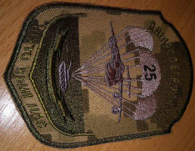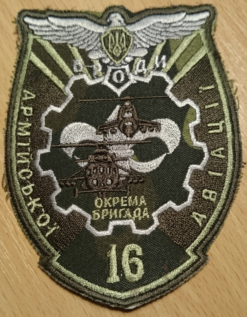Привезли шеврон 16 бригады армейской авиации. В прошлом году в сентябре летел их бортом. У них тогда большинство машин были Ми-8 без теплушек, без нурсов, без ничего вообще. Но пилоты - отчаянные! Правда и потерь у них в итоге больше любой другой бригады. 16 карательная!