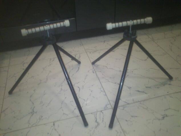 Следующий момент, это тренога. Были в наличии ножки, от обычного стульчика рыболовного, трехногого, на нем сама сидушка уже была порвана, валялись без дела. На этих ножнах все просто, необходимо тройник, соединяющий ножки, переставить наверх, и прикрепить на тех же дырках в трубках, на которых держалась ткань сидушки. Делается это при помощи обычных саморезов.