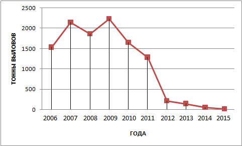 Ещё в недавнем времени, данный представитель ихтиофауны Азовского моря был один из самых многочисленных видов, а его выловы ещё в 2007 году составляли 2236 тонн. Согласно данным Бердянского территориального отдела АЗОВРЫБООХРАНЫрезультаты промысла пелингаса за минувший год опустились до 17,579 т., что свидетельствует о его значительном сокращении. Согласно графика, сделанного в программе Microsoft Excel, мы можем наблюдать значительную тенденцию к сокращению с 2010 года где выловы составляли 1651 т., в 2012 – 215, а уже в 2014 составили 52 тонны.