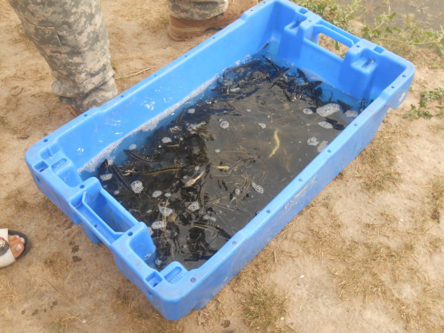 Было выпущено около 25000 мальков осетра. Их возраст — чуть больше трех месяцев, вес колеблется в пределах от 5 до 25 грамм.