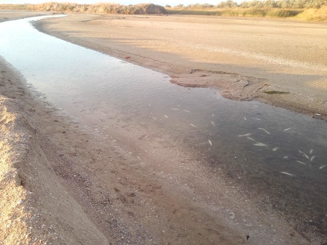 На сегодняшний день мы снова сталкиваемся с такой проблемой как и несколько лет назад — отсутствие водообмена между Молочным лиманом и Азовским морем. Проехавшись по побережью невооружённым глазом можно обнаружить что промоины, соединяющей лиман с морем как будто и не было. А ведь ещё в начале лета промоинафункционировала и по ней проходило большое количество таких видов рыб как атерина, пелингас, кефаль-сингиль, лобань и других. Казалось, что ситуация нормализовалась, однако, сегодня проблема появилась снова и является более чем актуальной а первые её последствия уже проявляются.