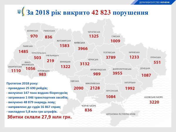 Так, з січня по грудень рибоохоронними патрулями та органами рибоохорони було проведено 25 690 рейдів. В результаті проведених заходів виявлено 42 823 правопорушення. З виявлених порушень 30% (13 019) є грубими.
