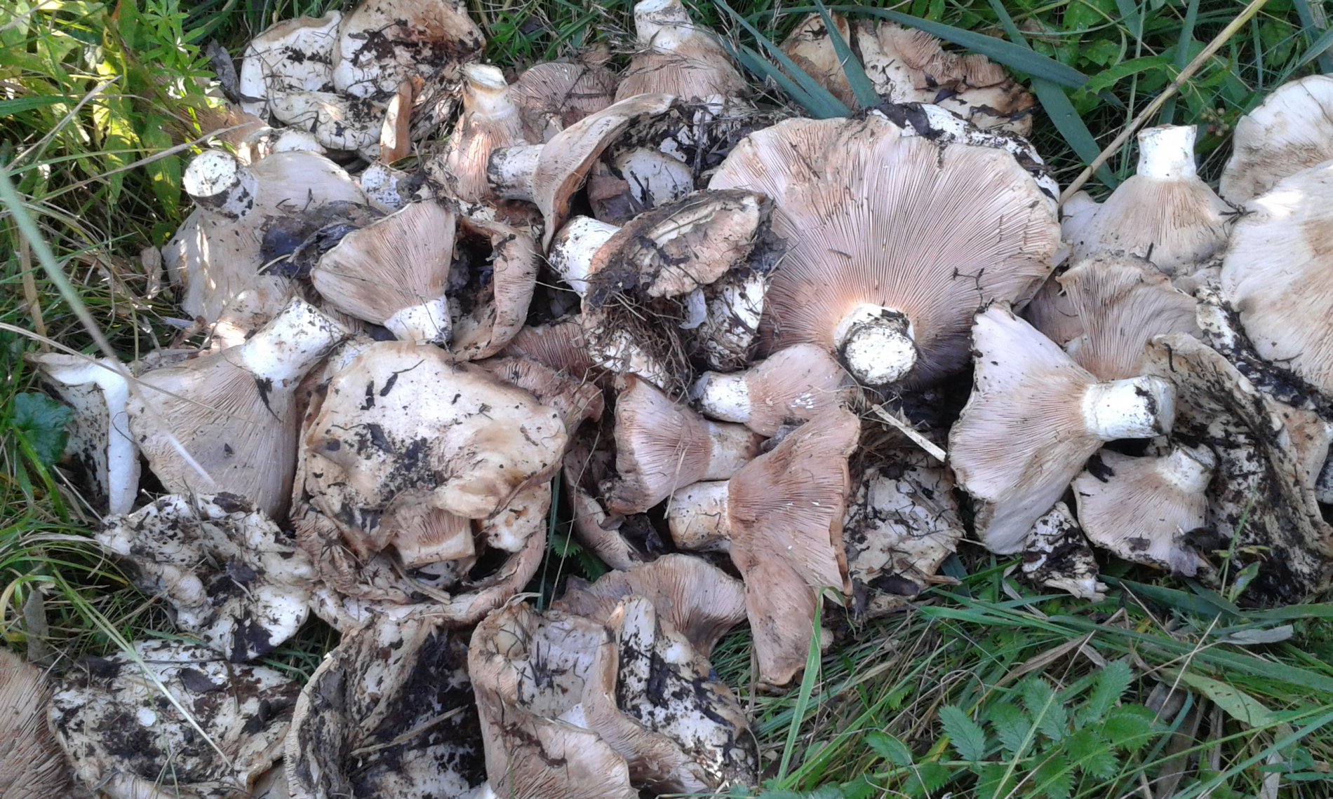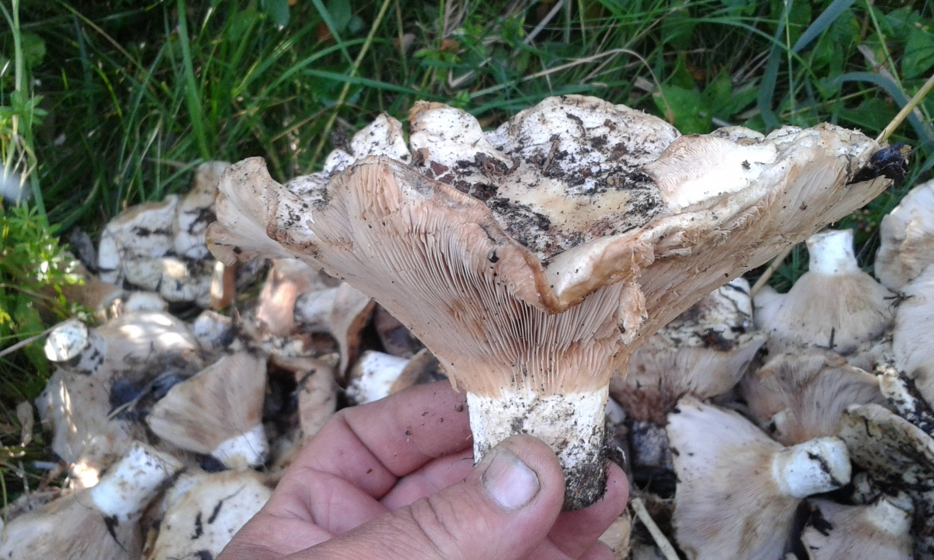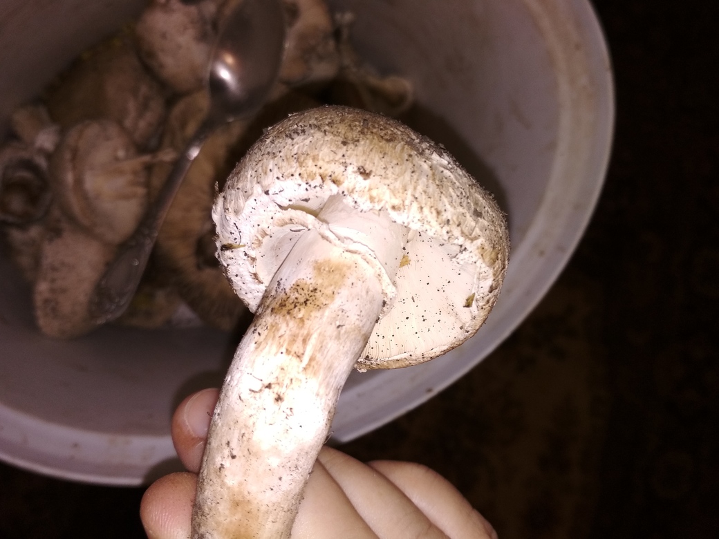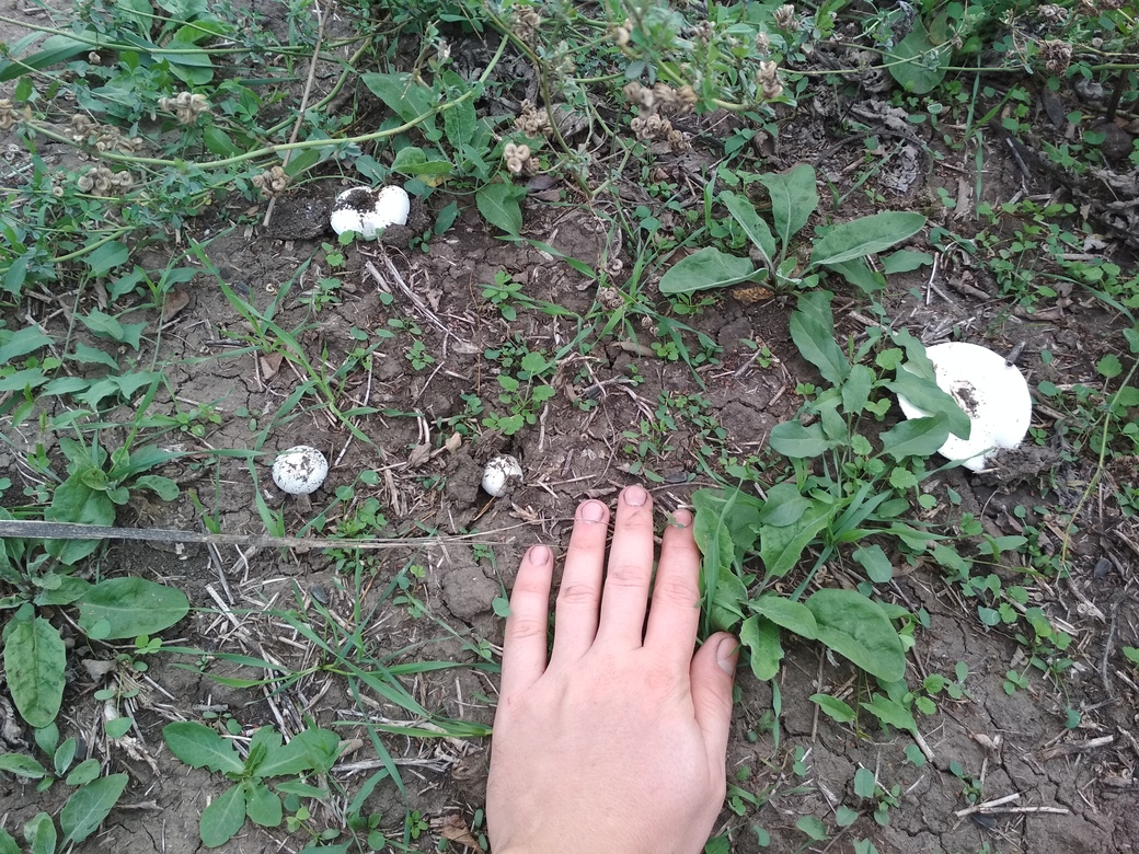 Помогите пожалуйста опознать гриб. Юг Запорожской области, убранное поле подсолнуха. Все поле усыпано этими грибами. Пахнет как шампиньон, только пластины не розовые, а белые.