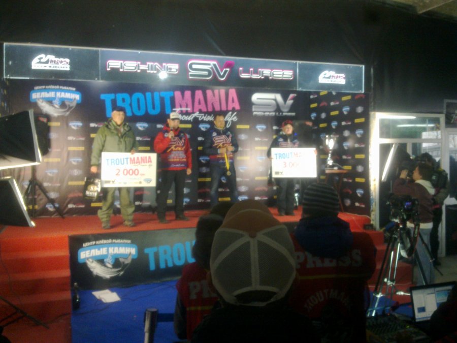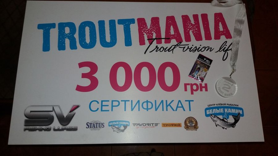 Статистика В Соревновании приняло участие более 120 любителей форелевой ловли со всех уголков нашей страны, а так же зарубежные спортсмены. Было проведено два отборочных тура. В ФИНАЛ вышли 50 участников. За время Соревнования на водоеме "Белые Камни" было поймано: 1 тур - 350 рыб; 2 тур - 510 рыб; Финал - 754 рыбы (это новый рекорд для этого водоема и данного Соревнования) Победители: 1 место - Диплом, Кубок, 10 000 грн. – Григорий Молодчик; 2 место - Диплом, 3 000 грн. – Виктория Зарицкая; 3 место - Диплом, 2 000 грн. - Александр Фролов.