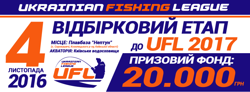 АНОНС UKRAINIAN FISHING LEAGUE - 2017 Починається престижне риболовне змагання «UFL 2017» Головний фінансовий приз за Перше Місце у фінальному етапі UFL 2017 – 100 000 грн. Обов’язковою умовою участі у фінальному етапі є проходження екіпажем відбіркового та двох основних етапів UFL 2017 Не пропустить свій шанс потрапити UFL 2017 4 листопада на акваторії Київського моря пройде Відбірковий Етап до UFL 2017 Місце проведення: Плавбаза «Нептун» (с.Сорокошичі, Козелецького р-ну, Київської обл.). Призовий Фонд – 20 000 грн. Більш детальна інформація на: www.UFL.FISH Презентаційний Фільм - Турнір UFL 2016