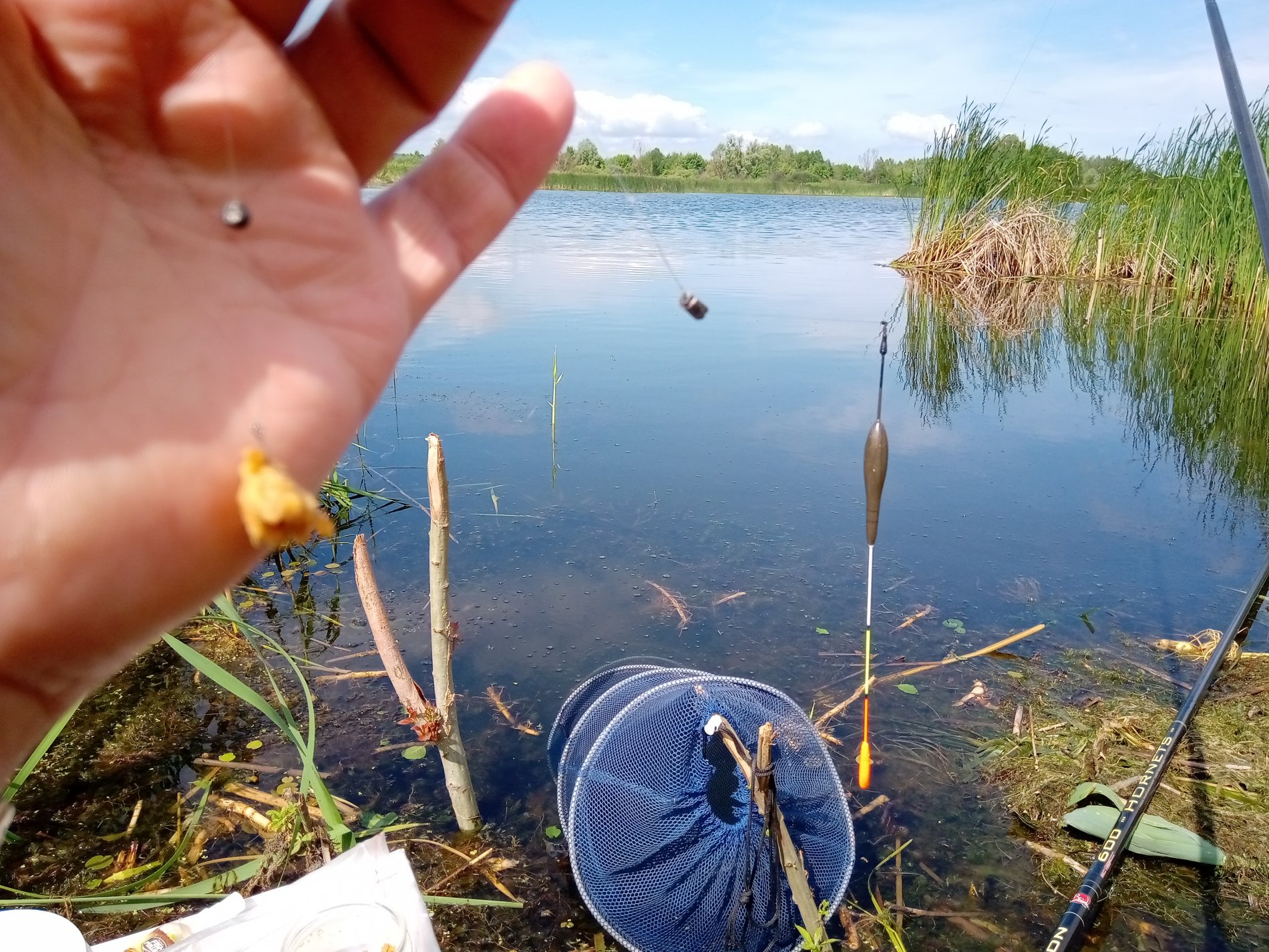 Клев был очень плохим. По разговорам соседей полный ноль даже мелочь не берет. Надо было что то делать и я захерабунил пылящие тесто. Про один вариант поводка с мини кормушкой я уже описывал. Смысл замена верхнего крючка херабуны для пыления на нижний крючок. Не по правилам но я ведь ловлю своей херабуной для себя. Второй мой стандартный, один крючок с подпаском. Ловля чисто с дна. Поводок с кормушкой и пылящим тестом через пол часа снял. Мини красноперка просто долбила кормушку. Просто тесто на крючке, тоже стягивалось ею на падении. Но иногда влетали приемлемые красноперки. Вот место ловли.