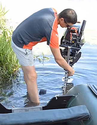 На водоеме легко выгрузить тележку из автомобиля, довезти мотор до лодки и навесить мотор на транец, не прилагая больших усилий, только после этого отсоединить тележку от лодочного мотора.