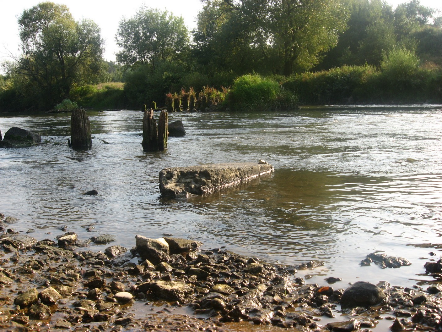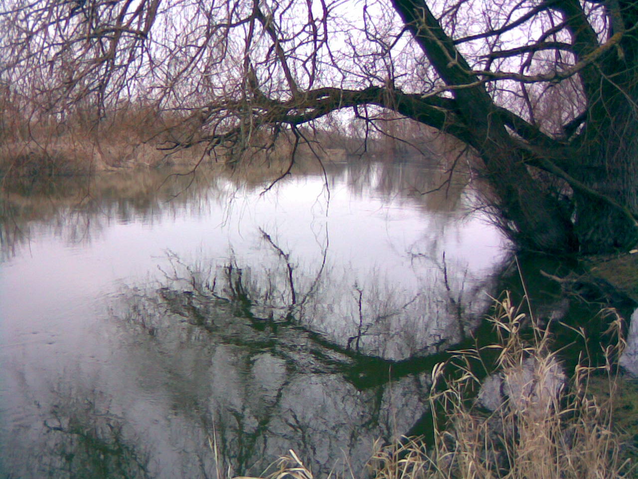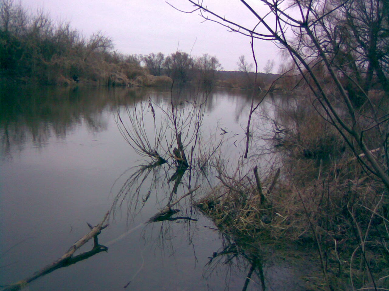 Привіт. Річка майже не заросла, всього кілька кущиків чогось схожого на кропивку під берегом і трави, схожої на валіснерію в невеличкому рукаві, більш нічого не бачив. Трави можна сказати нема, навіть літом дуже мало. Течія різна, на перекаті видно з фото - течія потужна. Вцілому ж річка не надто швидка, та іноді джигу 20-30 грам несе. Того разу на ближній бровці 10 грам більш-менш тримались, щоправда берег високий і мало шнура (ПП 0.15) в воді. Може і менше не зносило б. В генштабівській карті помітка 0,6 м/с в тих краях.