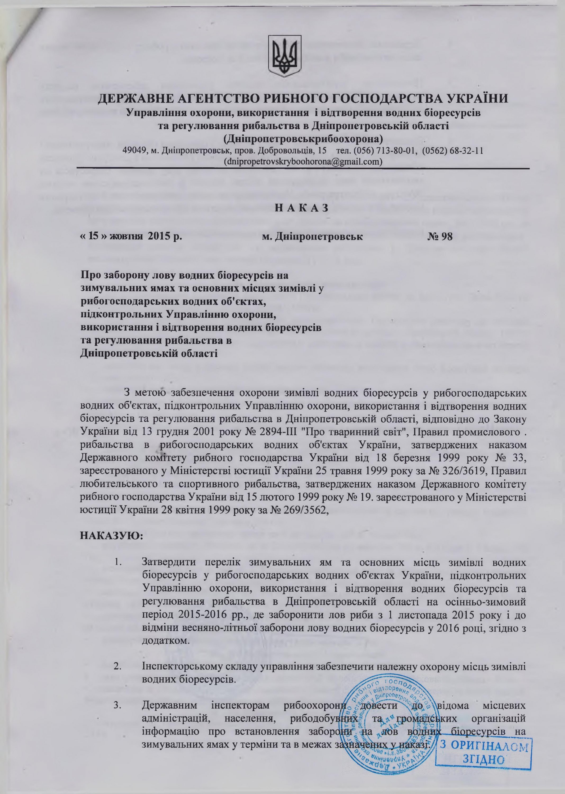 Запрет Заборона лову водних біоресурсів на зимувальних ямах в Дніпропетровській обл.