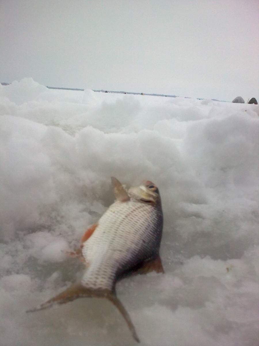 Сегодня. Пронозовка. 0,5 часа ходу от берега. Снега много-поэтому на дорогу потратили чуть больше. Нашли тот район, где ребята ловили в прошлое воскресенье. Куча рыбаков сидит чуть далее и то хорошо, хоть как не на базаре. Бурю пару лунок, опускаю грузовку в разведку. Через 5 мин - поклевка, потом еще пару и таранька чуть меньше ладони на снегу. Опускаю снова - пару поклевок и опять таранка только чуть больше ладони на снег. Можно ставить палатку. Разместился-и в бой.Клюет на легкое на нижнем крючке грузовки, опускаю мормышки рядом и цепляю хлебушек с чесночком (спасибо Олегу Короте подсказал). Вобщем потроху рыбка пошла и приятных размеров-ладонь, чуть больше, проскакивали и вовсе достойные экземпляры. Пронеслась мысль, что за целый день намашемся руками. Короче хороший клев до половины первого дня, потом периодический и очень "рваный" (как будто мелочь). Рыбка с обеда стала попадаться реже и реже, теплили надежду на вечер, но к сожалению практически зря. Перепробовали все возможные насадки и их комбинации, но жор так и не начался. Погодка днем конечно была супер - пришлось в палатке раздеваться, к вечеру стало хмуреть небо. Глубина ловли порядка 6,5-7м. Норма выловлена и отправлена в соль. Всем удачи.