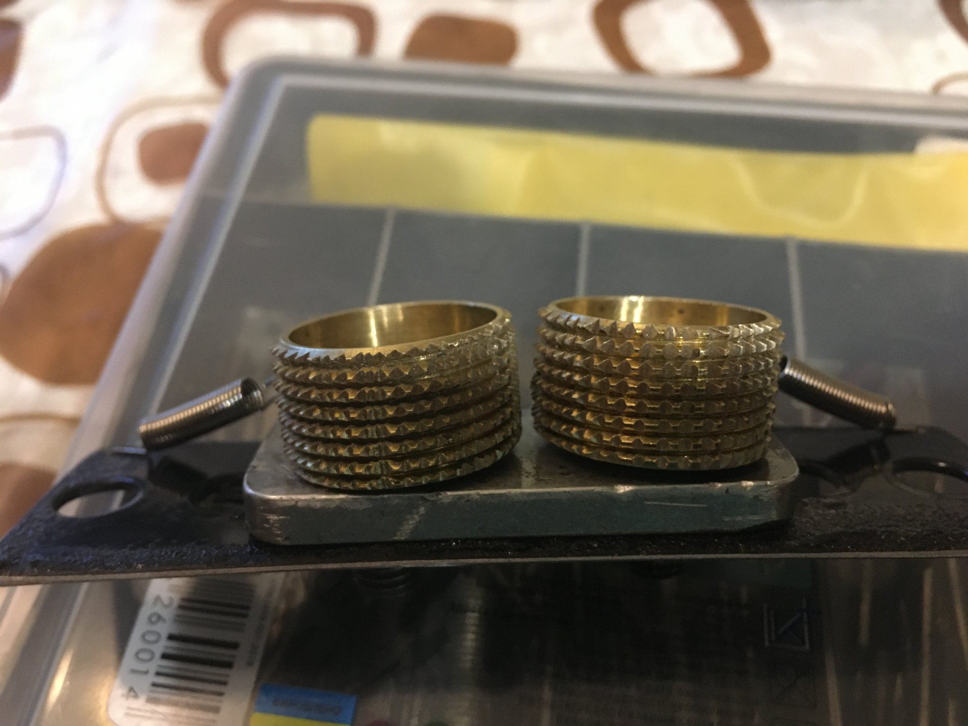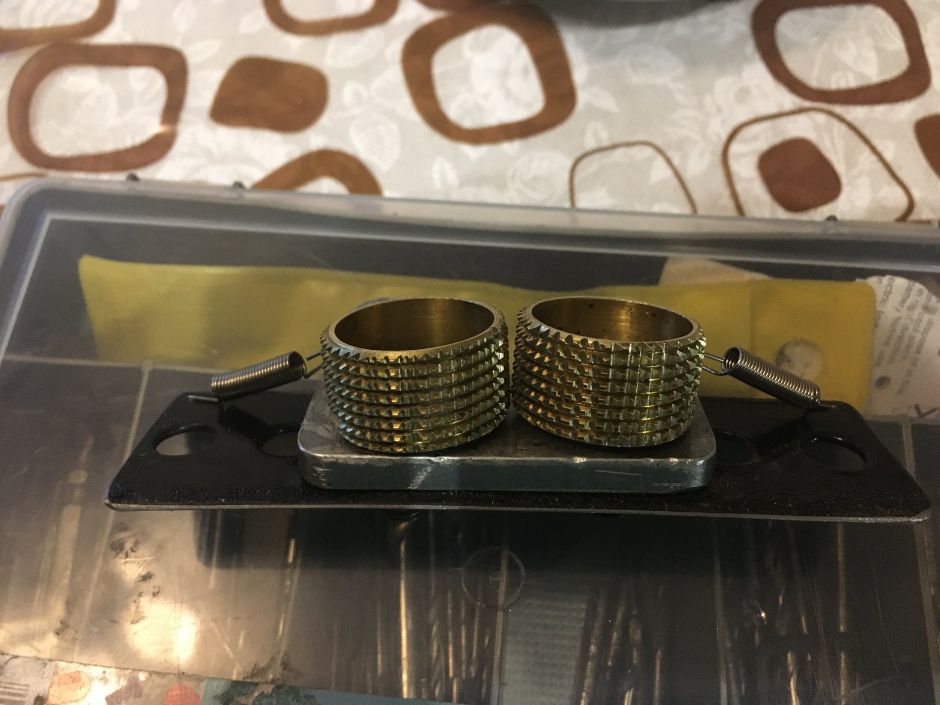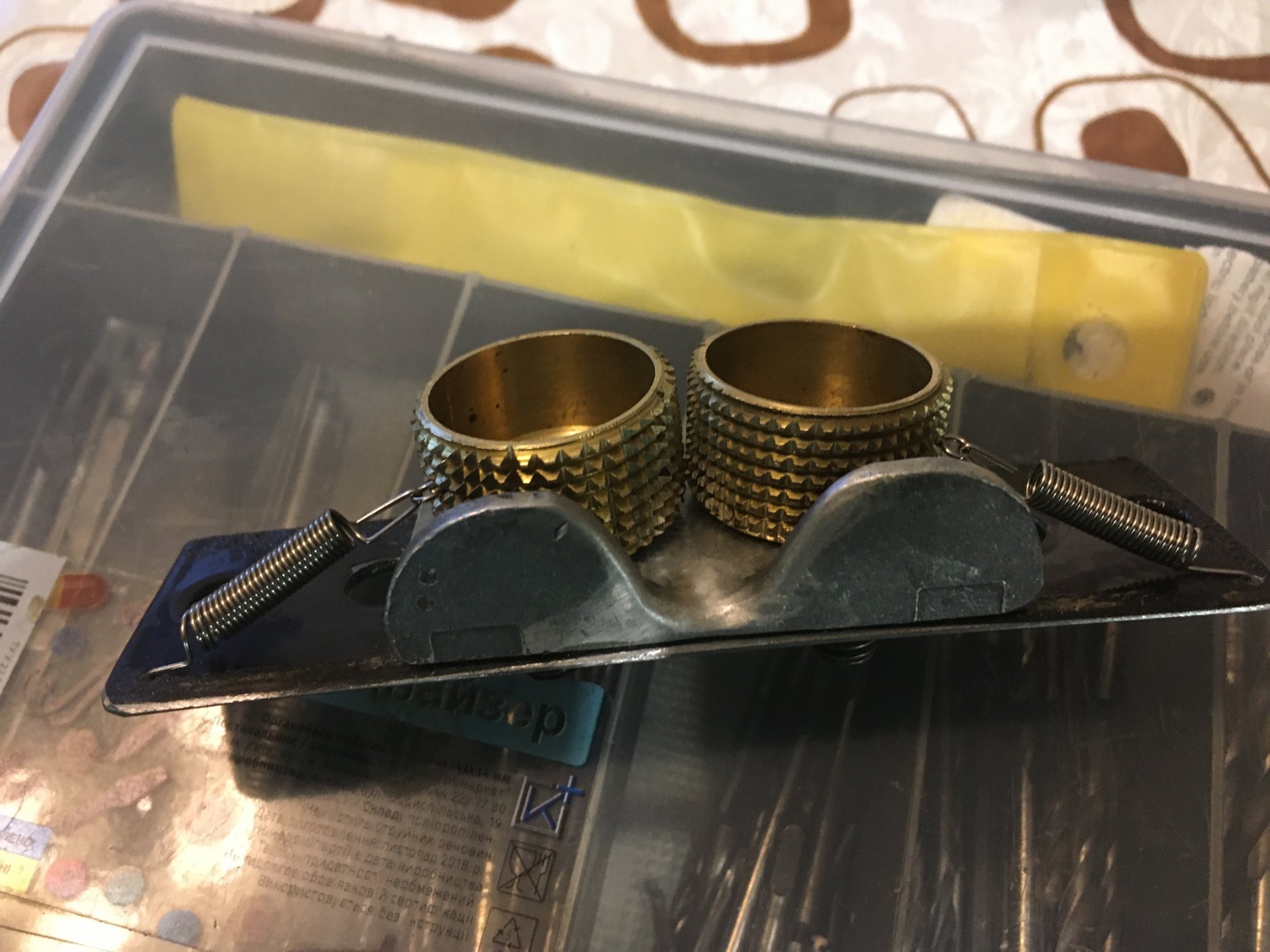 Ролики экцентрики от смесителя с пропилами для лучшей сцепляемости с фалом. Основа от регулируемых ножек мебели (силумин), пружины нержавеющая проволока 0,6мм (для поводков для джерков) + два болта и две гайки М8.