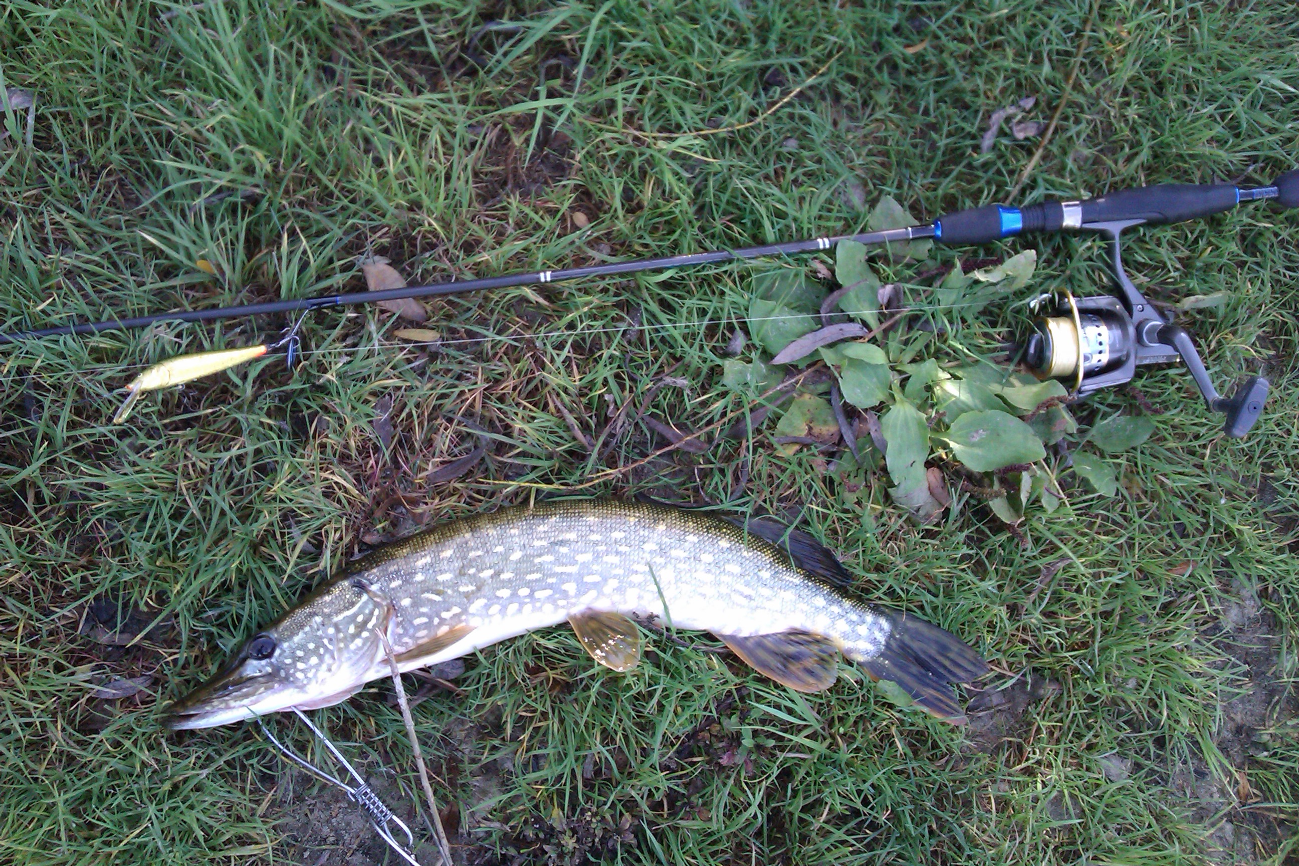 Так и прошёл вечер, а утром была рыбалка :). Пробежавшись по Орели и получив по 1-2 поклёвки решили проверить канал Днепр-Донбасс. Перебежали туда. Народа было прлично. Рыбка тоже присутствовала. Не порадовала картина, как пара компаний не смущаясь паковала в садок щурят грамм по 400. Мы же поразвлекались мелкоокунем на микрушку. У товарища была одна поклёвка в стиле отдай палку со сматыванием метров 30-40 шнура и последующим отрывом приманки. Абидна. Дальше начало припекать солнышко. Я попробовал поупираться в воблерки - изловил щучку на рапаловский х-рап и сходшнурка под ногами на сквад минноу 95 от братьев шакалов.