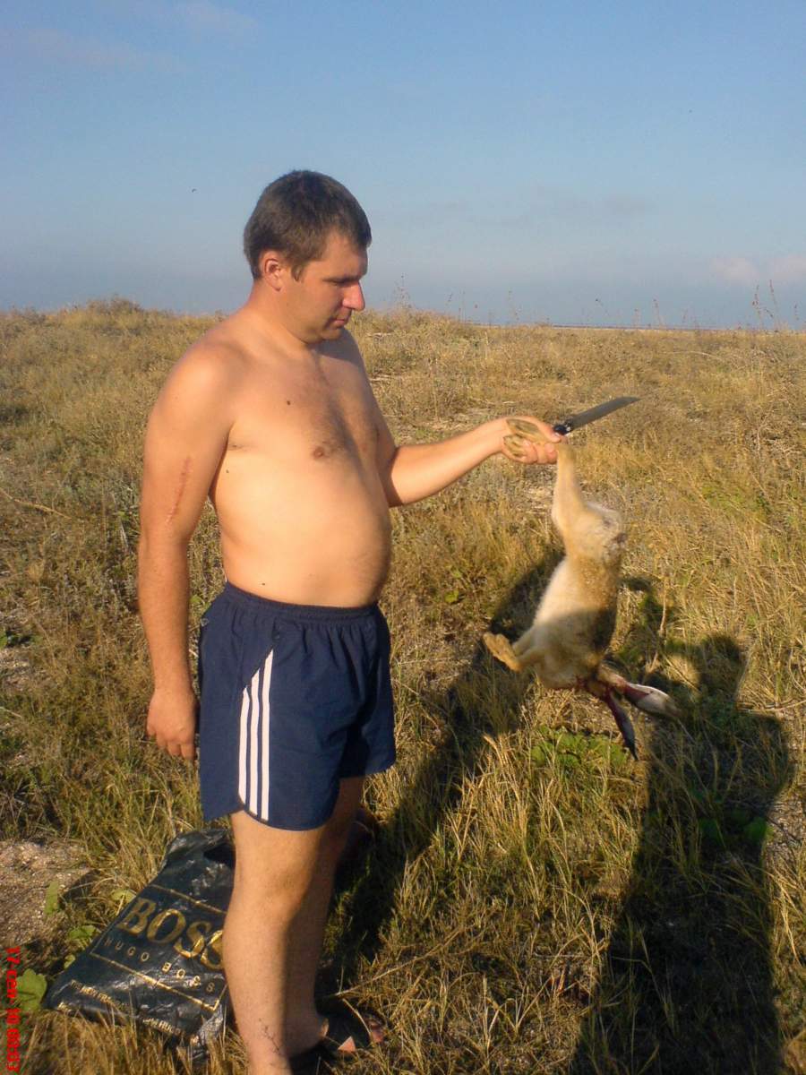 Выезжаем в ночь. Дорога прошла без проблем, потому что я спал на заднем сидении :gi-gi:. Подъезжая к Геническу, я был бесцеремонно разбужен, т.к. водитель ехал впервые. Нам оставалось проехать Геническ, Счасливцево, последний населенный пункт – Стрелковое. От него по «стЕральной доске» (дорога такая) еще 10 км. Проезжая по дороге со скоростью 40 км в час, на дорогу из темноты выпрыгивает заяц. По тормоза. Но не тут то было. Заяц как вкопанный, под гипнозом фар останавливается нам на пути и смотрит на нас. Это все происходит в секунды. Если бы мы не тормозили заяц проскочил бы под машиной, а так… :(Выходим из машины – готов. Ну не оставлять же его на дороге собакам. В команде был охотник и специалист по кроликам. Он предложил разделать его и приготовить жаркое. Получилось, что рыбалка началась с охоты.