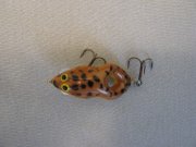 Просмотрел сообщения по этой теме и не нашел упоминаний о воблере Frog («лягушка») от фирмы DORADO. Это интересный и очень уловистый воблер (на нашей речке). Особенностью его является широкое приплюснутое тело с отверстием в задней части, см. фото 1, 2. Такая форма придает ему устойчивость и широкую амплитуду колебаний. Фирма DORADO выпускает этот воблер в четырех расцветках и двух размерах (правда на сайте фирмы сейчас представлен только меньший размер, возможно большие воблеры уже не выпускают).