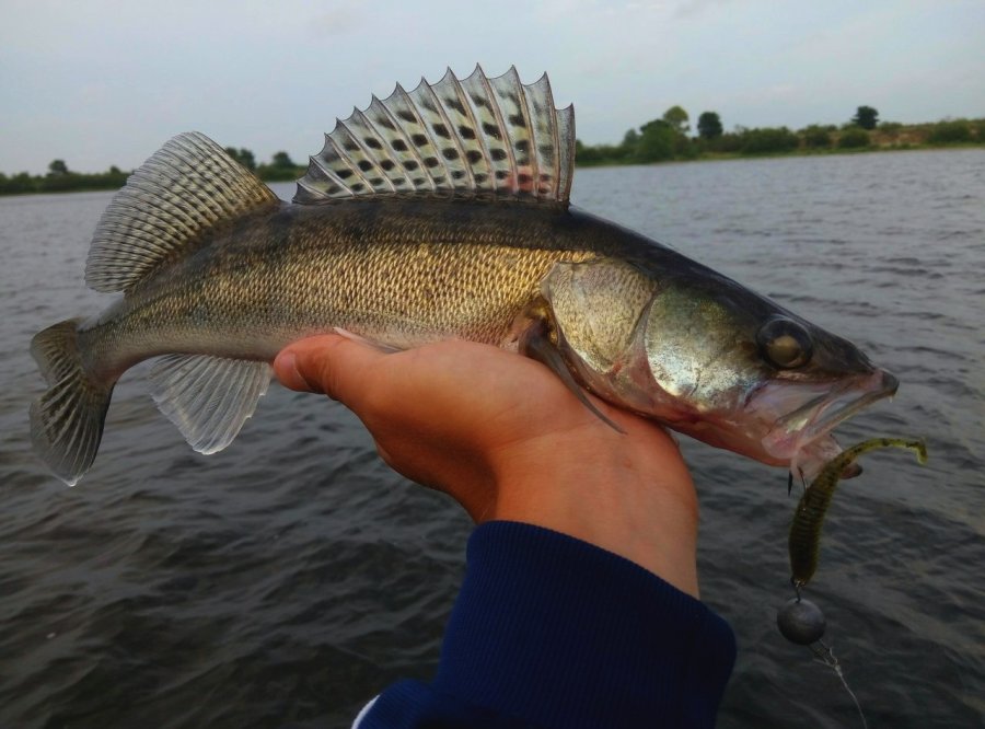 Ловить начали после обеда. Пока ветер был еще терпим , проверяли старые и "проверенные" точки ,которые мы уже знали. Судака хватало, на каждом месте брали от трёх до семи-восьми хвостиков,но они к сожалению были не крупные.Стоять и ковырять рыбу смысла не было из-за ветра,поэтому больше пятнадцати минут мы не задерживались. С клыкастым попадался и окунь приличных размеров,но это было скорее исключение ,чем правило. Спустя два часа ловли совсем мелкий и очень мелкий судак уже начали надоедать и мы приняли решение поискать щуку. Мест особо мы не знали,поэтому привязывались к траве у берега,но кроме окуней в прибрежной зоне мы нечего не увидели. Ближе к вечеру поднялся очень сильный ветер и начал моросить не приятный дождь. Но на вечер была заготовлена самая "вкусная" точка ! Как по учебнику,с потемнением,туда пришел покушать судак. Ну а мы тут-как-тут ;)) Минут двадцать продолжалась раздача, каждый заброс приносил рыбу,которая немедленно освобождалась и отпускалась. Картину испортила погода,не дав нам до конца насладиться мощными поклевками днепровского судака. Так и закончился наш первый день.