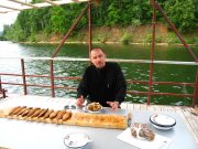 Приобрел по смешной цене (150 грн., с рук, но новая) коптилку Вояджер. Не терпелось испытать... Обещал, отчитаюсь - все получилось! Не идеально внешне, но вкусовые качества скумбрии горячего копчения были отменные! По порядку: 1. С вечера переложил скумбрию с морозилки в обычное отделение холодильника размораживаться. 2. С утра удалил внутренности (жалко было выбрасывать икру) и жабры, натер рыбу смесью соли и перца (специи решил не использовать, чтобы был натуральный вкус скумбрии). 3. В обед после работы рванул к семье в село, скумбрию из миски переложил в кулек... По приезду промыл в воде, связал шнурком хвостами и повесил под навесом подсушиваться (около часа). 4. Насыпал как и рекомендовалось 0.5 гранчака опилок. Какие не знаю, достались в нагрузку к коптильне, но судя по всему - правильные. Натер подсолнечным маслом рыбу и решетку. Зажег горелки, поставил коптилку на горелки. Как пошел дымок - засек время. Но тут оказалось, что одна из горелок потухла - огонь бесцветный, а день был солнечный... Кстати разжечь ее было не просто - подношу спичку слышится хлопок, подношу руку - вроде горит, проходит пару минут - потухло. Короче время сбилось и видимо немного передержал... И рыба как бы вывернулась... Но вкуснотища - половину рыбы дети съели пока я ходил в хату за хлебом ... Вторую рыбу оставил жене которая была в поле - пришла и умяли на пару с сестрой... Короче мне досталась только шкурка от первой рыбки . Фото готового продукта нету в связи с ее не очень эстетичным видом и очень быстрого поглощением . Короче чрезвычайно доволен и всем рекомендую! Продолжение будет однозначно