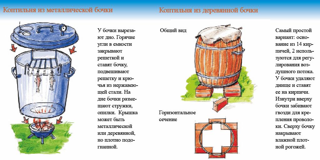 Какие добавлять пряности и в каких количествах, зависит от личных вкусов. Подходят для копчения рыбы кориандр и базилик, тимьян, розмарин. Для жирной рыбы хороши чабрец, укроп, паприка, тмин и индийский карри. Для постной рыбы – шалфей и мускатный орех. Петрушку и фенхель добавляют по вкусу, в копченой рыбе они нравятся не всем. Такие рыбы, как щука, хариус, сиг, форель, угорь, имеют сильно выраженный вкус и аромат, которые при копчении лучше сохранить. У других рыб, особенно карповых, этих качеств нет, поэтому перед копчением в рассол добавляют пряности, предварительно обдав их кипятком. Если во вспоротое брюшко и под жабры добавить зелени, то рыба приобретает дополнительный аромат. Судак и щука будут вкуснее, если в тушки уложить несколько пучков горного сельдерея, побеги лука или чеснока.Примитивная коптильная печь – это, собственно, труба-дымоход квадратной или круглой формы и достаточной ширины для размещения рыбы. Трубу делают из подручных средств, для этой цели подходят деревянные или железные бочки и ведра без дна, ящики, старые водогрейные колонки, канистры. Как и в обычной печи, для задержки пламени устраивают «колосник»: на решетку из металлических прутков укладывается ряд небольших камней. Сама печь-труба устанавливается над колосником. В печи подвешивают рыбу на проволоке, крючках или раскладывают на решетке. При этом следят, чтобы рыба не прикасалась к стенкам и друг к другу.