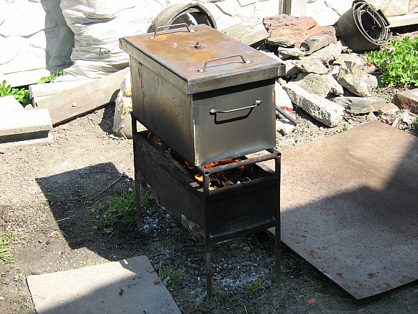 В с.Бехтеры на Херсонщине был соучастником приготовления копченостей в подобной "установке". В дно 200л. бочки вварен "стакан" из 2х. дюймовой трубы около 400мм длинной( резьбавое соединение с бочкой). К самой бочке приварен метровый обрезок еще одной бочки 200л. Уже в нем сделаны отверствия под"шампура". В "стакан" засыпают сахар и древесные опилки(несмолистых пород деревьев) в соотношении 1\1. Вкрутил в бочку, паяльную лампу к "стакану", продукты на шампура и в бочку, накрыть "старой фуфайкой"....40 - 50 минут! Все "продукты" мариновались перед копчением.