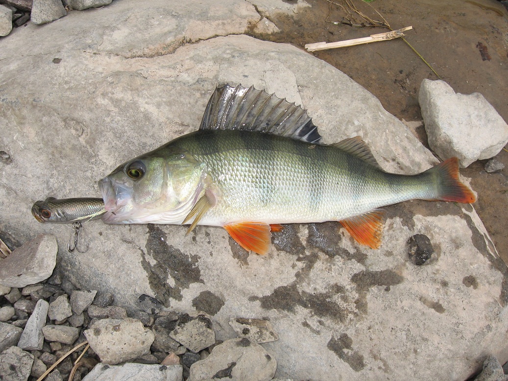 Зранку рибалив в забродах і зміг обловлювати межу трави на звалі в русло. Тут найкраще себе проявив Бент Міннов. Далі від берега окунь попадався крупніший, хоча дрібнота також проскакувала. Один "зацєнтий" находу схопив мегабасівського Стіп Кета, коли я його вже виймав з води. До 8 -ї години риба перестала проявляти признаки життя. Тому переїхав в Хрінники. Нижче ГЕСу жерех "чудив" по повній. За мальком мало на берег не вистрибував. Але нічого я йому зробити не зміг ))) Не піддається мені поки що жерех :пардон: Гад )))