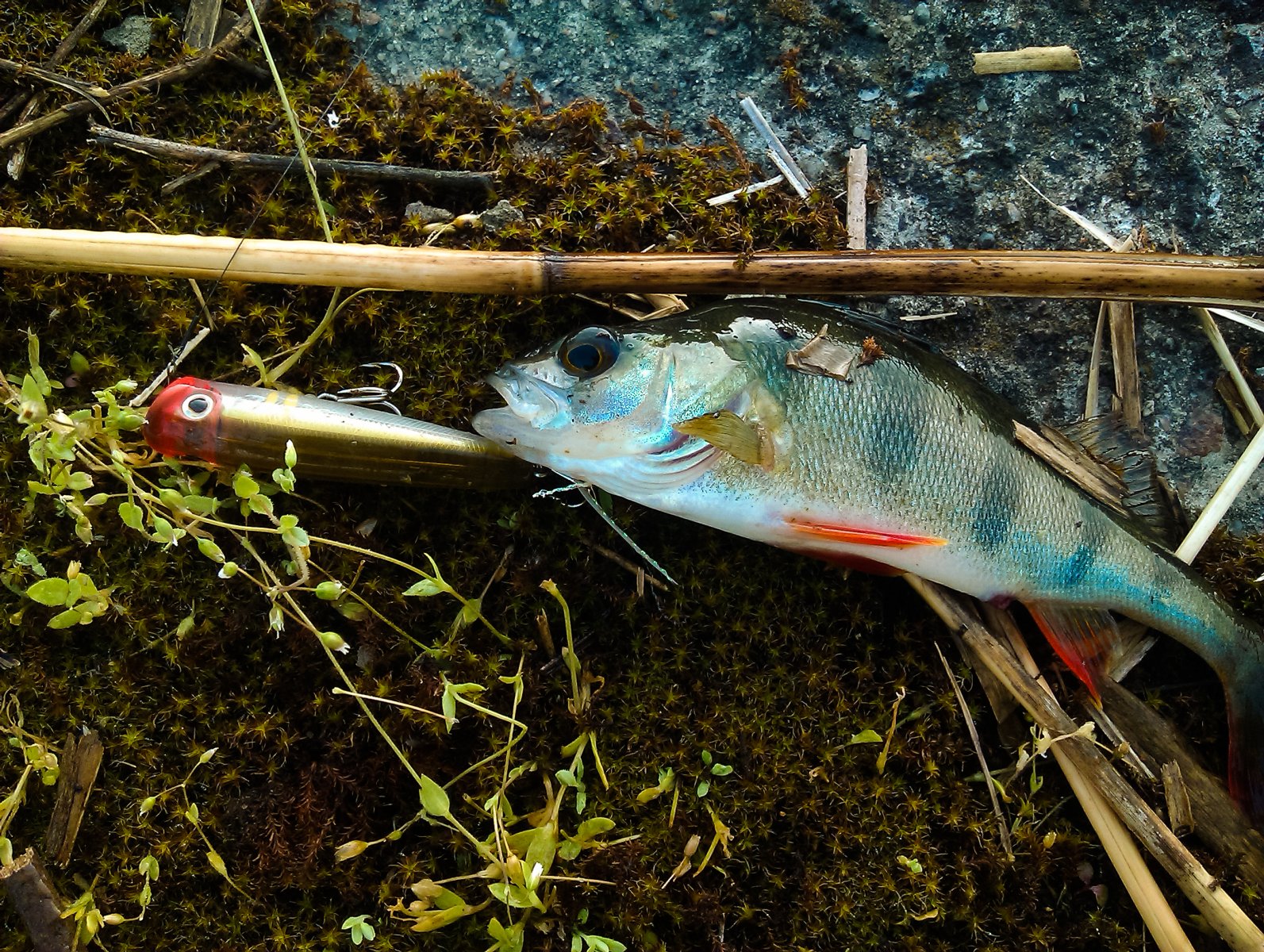 Дійсно, рибалка видалась доволі цікавою. Прийшовши до води розпочав традиційно з мікрогуми, але одразу після закиду помічаю як мальок вискакує з води, а за ним гарно чвакаючи окунь, розумію, що окунь доволі активний і одразу міняю гуму на воб. Міджик, якого Sywооch охрестив "тигриком" приніс першого окунця, за розмірами трохи більшого за самого "тигрика". Через кілька хвилин на того ж таки міджа спокусився ще один, але вже більший. Бажання розловити всю коробку з мікровобами результату не принесли, вперто працював лише "тигрик", був ще вихід окуня на новопридбаний чабі поппер, на жаль лише вихід, на гуму було лиш кілька невиразних тичків. Напевно день був такий, окунь відзивався на активну гру приманки. Після водосховища вирішили заїхати ще на одну водойму, там намалювалася така ж картинка, окуні на "тигрика", гума знову мовчала.