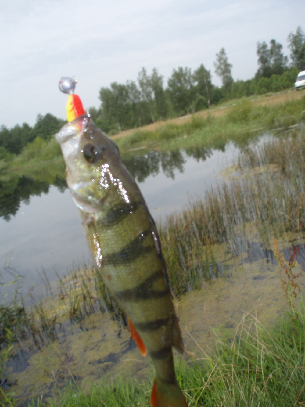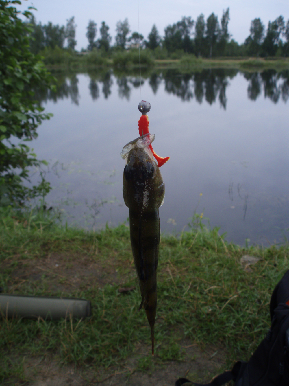 Всем привет!:gimmefive2: Сегодня с утра решил не тратить попусту выходной - то есть собрался побросать спиннинг на близлежащем жабовнике. Придя на озерцо к своему сожалению убедился что из-за устоявшейся жары рыба не активна даже в 6.00 :злой: Но делать нечего, как говорится у военных "Вышел в поле - действуй по боевому!". Расчехлил спиннинг и начал облавливать прибрежные заросли. Начинал с вертушек (хотел новые разловить, затем в ход пошли плавающие воблера, затем виброхвосты незацепляйки - результат тот же "0":стыдно:). После всего этого решил взять свой УЛ спиннинг, поставил на него тоненькую флюрокарбоновую лесочку от Trabukko (по моему так пишется, не уверен) и стал ловить на МДЖ (остановился на дюймовом виброхвостике Relax), который вязал напрямую к джигголовке. Окунь себя проявил очень скоро, не скажу что клёв был сумасшедший (рыбалка вышла трудовая:somyara:) но как приятно было мне, когда я путём проб и ошибок наконец-то вычислил его любимую проводку. А именно плавная равномерная, переходящая в лёгкий твиччинг (особенно на границе каких-либо зарослей). Фотоотчёт представляю ниже...Всем "Ни хвоста, ни чешуи!" :присоединяюсь: