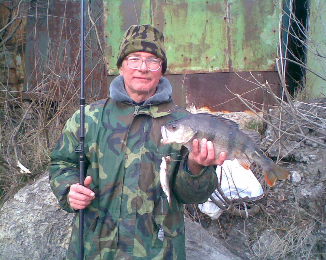 1. 29.03.2008, 09:00, г. Запорожье, левый берег, с берега, район 9-го причала - это чуть ниже города. 2. Спининг Werewolf Boat, 2,7 метра, тест 100-200гр. Катушка Flagman Inspirer IS 3000. Леска 0,25 Carbotex Filament. Пружина с кашей и макухой, три крючка №6-7, наживка - сало, груз 80 гр. с подьемником. Обыкновенная снасть на тарань или карася для ловли с берега. 4. Вес 1750 гр., окунь. Фото в вложении.