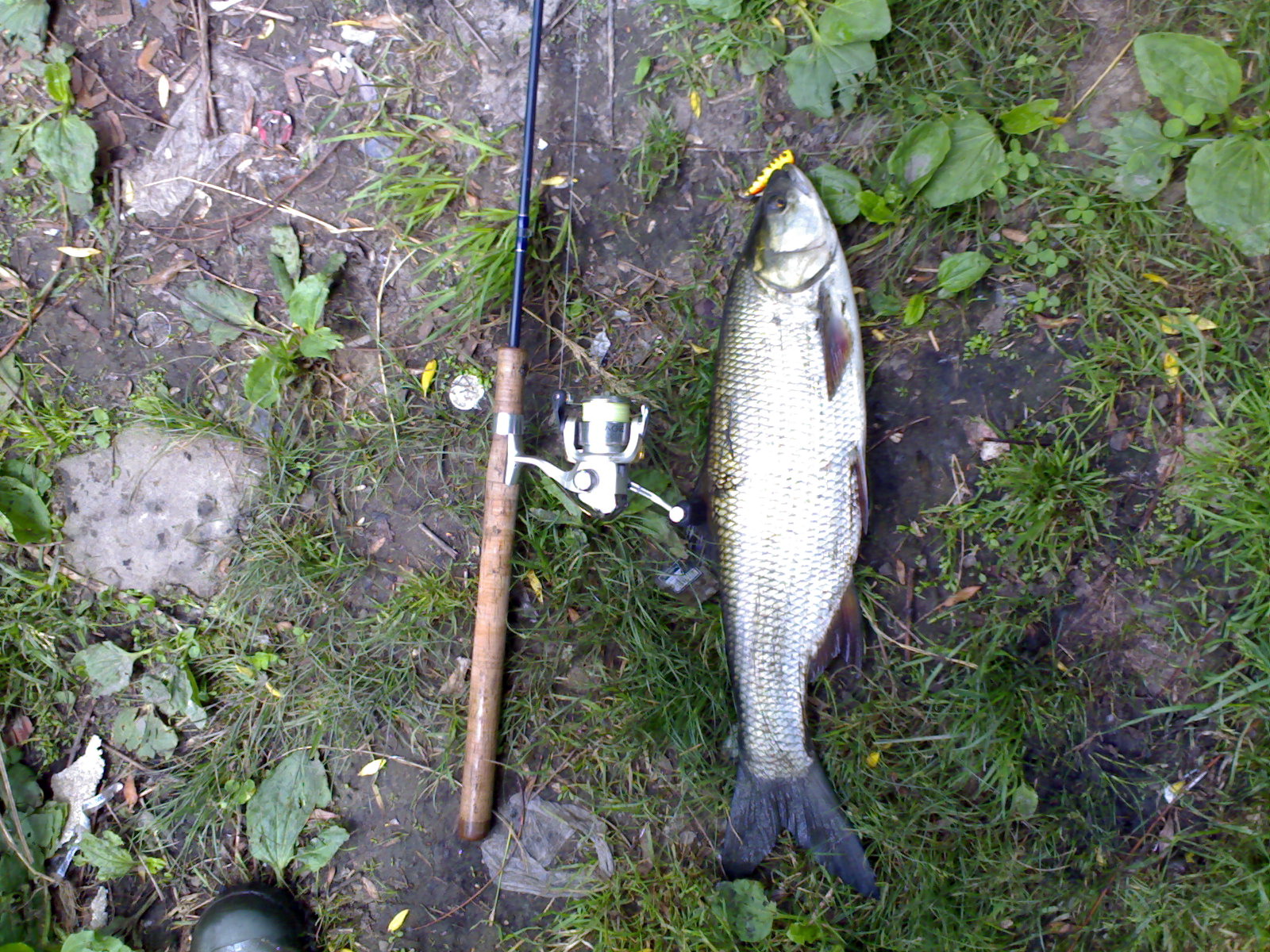 Был пойман 05.06.08 в 13-05 дня. Киев, залив Днепра, недалеко от м.Осокорки Спиннинг Banax Ultra тест 3-14гр. Катушка Шимано Exage 1000 Hитка 0,13 PE Super. Попер Yo-zuri Армс Поп Микро Жерех. Вес на берегу 2кг. При взвешивании дома через четыре часа, весы показали 1.9 кг.