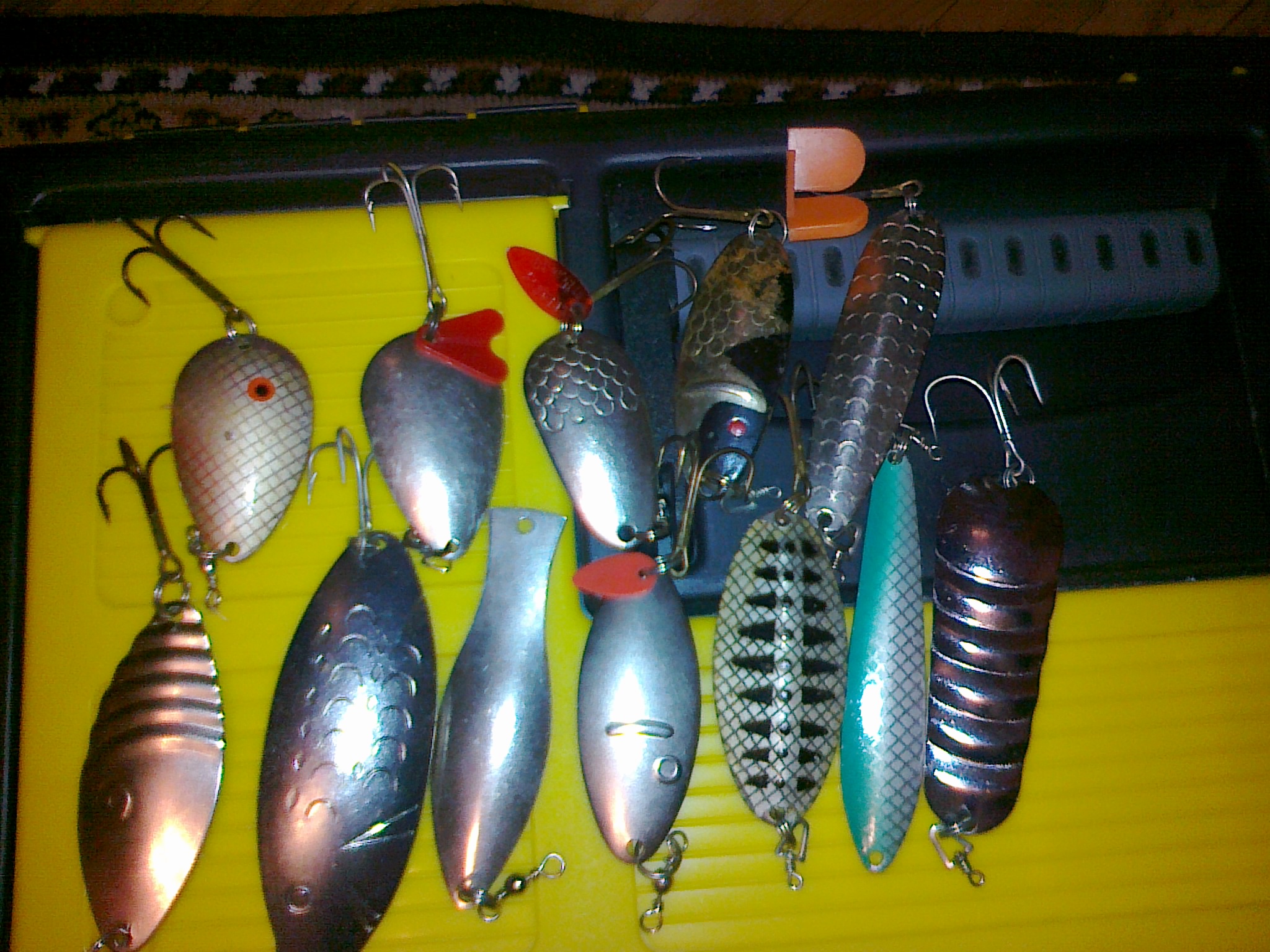Среди блесен, в своё время мною горячо любимые "Кес Спинер", "Ложки" и джиговая "Волна" (нижний ряд крайняя правая).