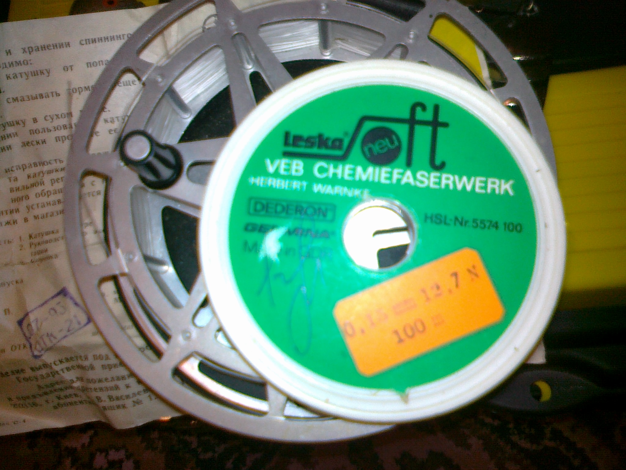 Но больше всего удивило наличие 100 метровой катушки "новой", непочатой, ГДР-овской лески Гермина-Дедерон, диаметром 0,15мм и разрывной нагрузкой 12,7Н (1,2кг).
