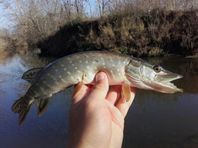 Утром намотал приличный километраж в поисках щуки. В определенных местах трава еще стоит густым ковром и приходилось пробираться по густым кустарникам с точки на точку. Так как на этом участке речушки я почти, скажем, местный, то пару очень локальных мест были сразу же проверенны на наличие здешних хищников. Результат есть! "Козырные" точки закончились почти сразу и далее я монотонно пробрасывал однообразные и заросшие места. С боем взял пару стандартных щучек, не более...