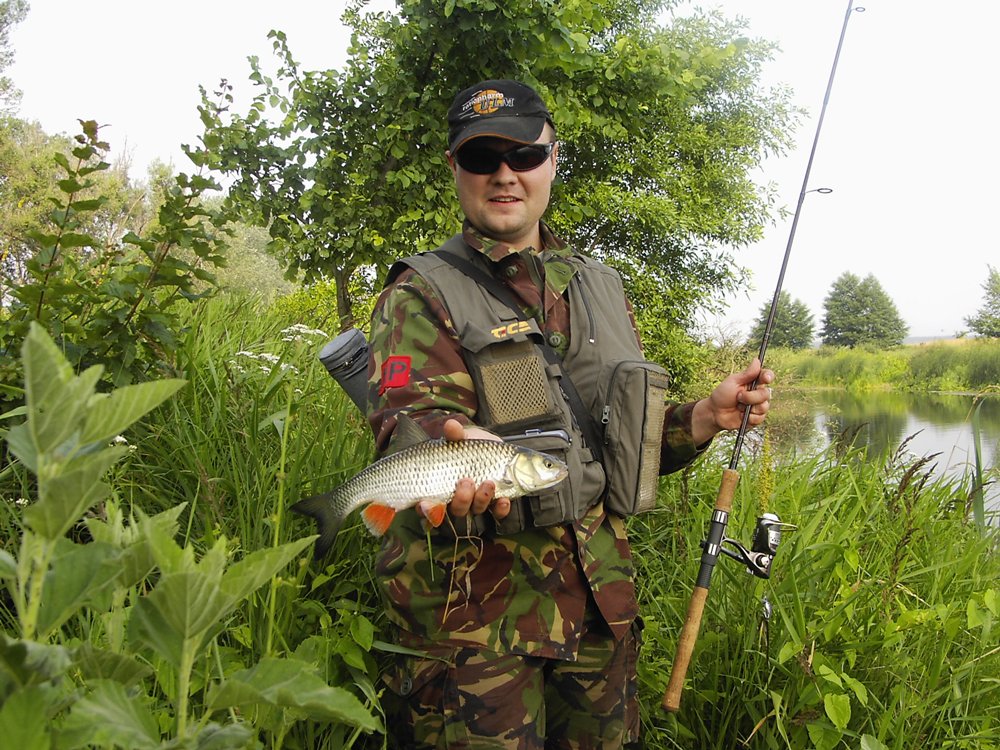 Спустя какое-то время услышали из близ лежащих кустов радостный крик Жени, он взял приличного голавлика длинной 35см. Голавль позарился на Yo-Zuri L Minnow 33 фиолетового окраса. Взял сразу, на всплеск. Это был первый Голавль в его жизни. В дальнейшем мы видели огромное множество зачетного Голавля, только я видел четыре зачетных особи и одного гиганта килограмма на два плавающего под самым берегом и не обращающего внимания на воблеры. Один раз стайка окуня выскочив из кувшинок провожала мой зурик, но ни один полосатик так и не решился на атаку. В результате сделали привал, но долго он не продлился, рядом было гнездо шершней и они быстренько пожаловали на званый ужин. День близился к концу и пора было возвращаться. По пути обратно зашли в подобие кафешки в местной деревеньке. К нам подсел пьяный мужик и начал жаловаться, что рыба в сети не идет, паук не ловит и вообще молодеж не чего осетях не знает, мол вымирает его дело:gi-gi: Подобные речи еще больше приподняли нам настроение! Единственное, что растроило, это его рассказ о Харьковских ихтиандрах на дорогих лодках, с дорогими ружьями для подводной охоты и непомерными аппетитами... Говорит выбили всю крупную рыбу. И это правда... Ихтеандры - это стихийное бедствие которое уничтожает сомов, щук, судаков гигантских размеров. Некоторые просто выбрасывают потом свою добычу. Денег у таких людей много, можно и купить ту рыбу, но нет, надо убить и незнать меры в этих убийствах.