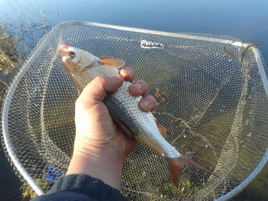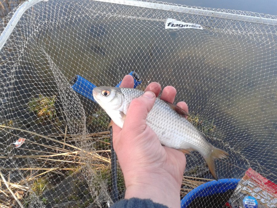 Удостоверившись что дистанция выбрана правильна(т.к.шнур был заклипсован с прошлой рыбалки) положил со старта 7 кормух привязал поводок 00.8 с крючком №18 и вперед :).Разловился с первой кормушки бойкая плотвица у меня в руках.