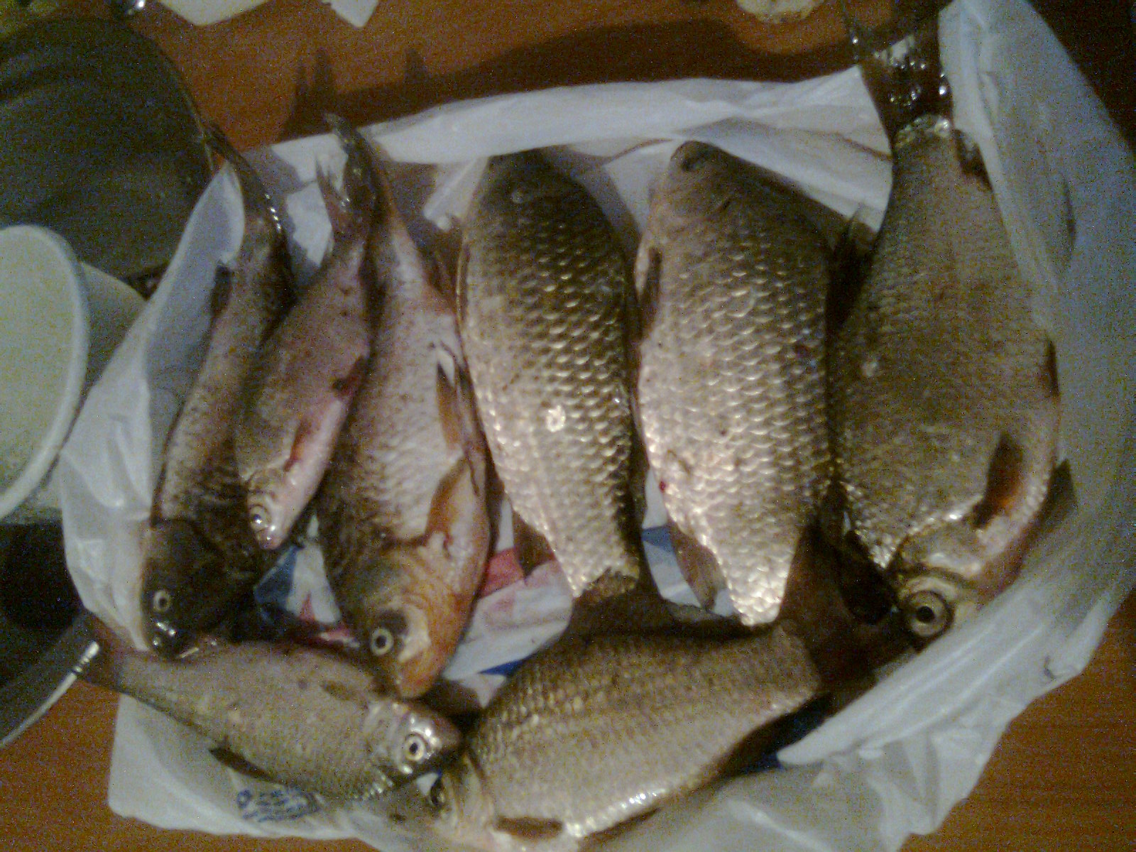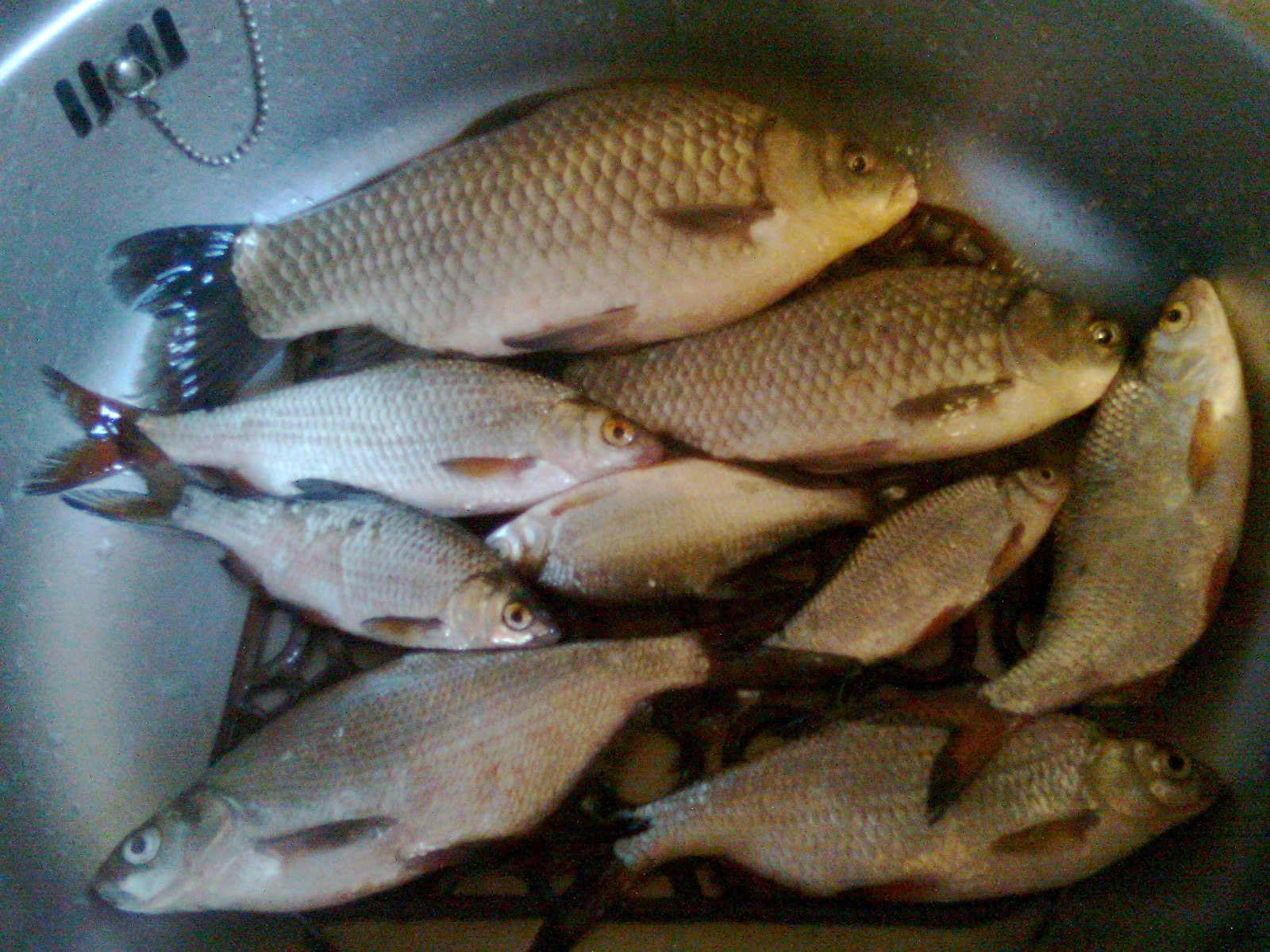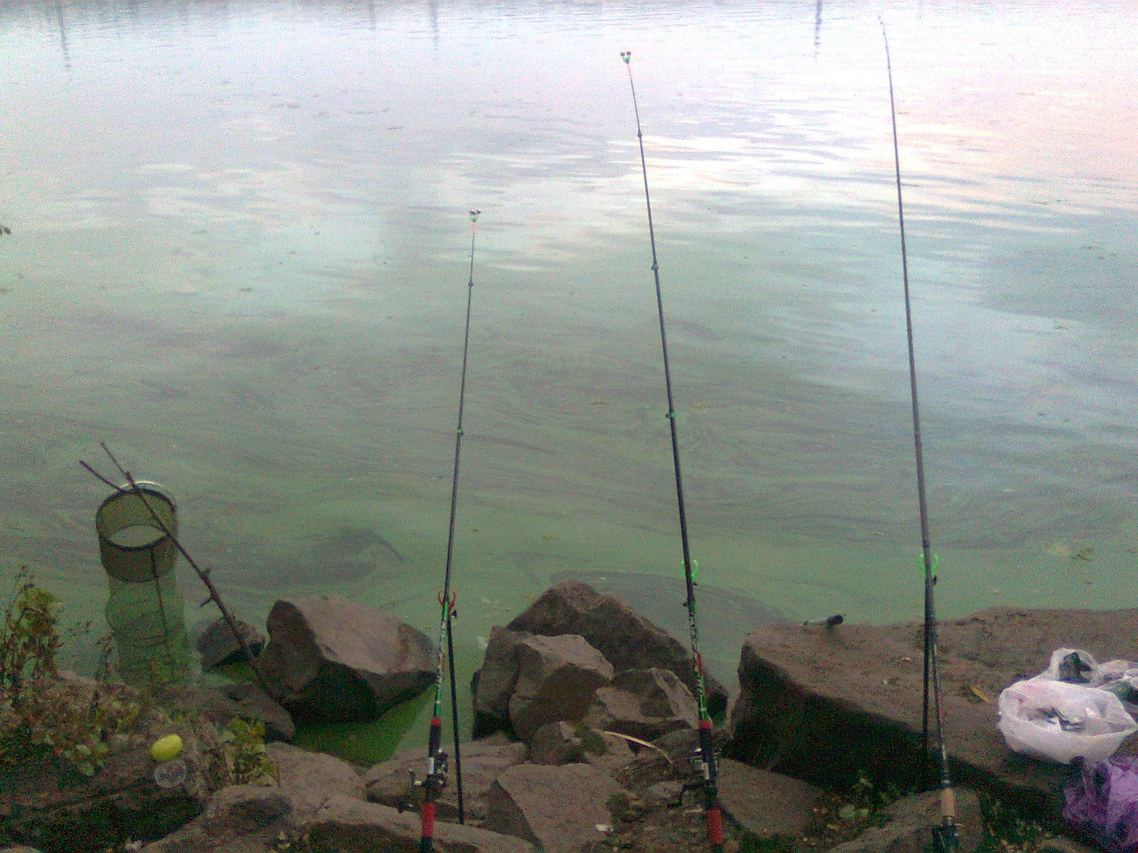 17.09 Вторник, с 17.00 до 20.00 опять на гадке, на той-же косе, рыбаков было не много. Днепр весь цветет, и по всей площади несет всякую фигню траву, островки, слизь и еще не понятно что. В таких условиях ловить не очень комфортно, так как вся эта хрень цепляется, на натянутую леску, и оттягивает ее в сторону, создавая ложные и мешая увидеть нормальные рыбьи поклевки, из-за этого перебросы чуть-ли не каждые 5 минут. Ну кое что поймать удалось, попался и зачетный карась, когда вытащил думал около 800 грамм, но дома весы показали 1140 грамм, жирненький оказался:)). Как всегда ловилось на красного червя.