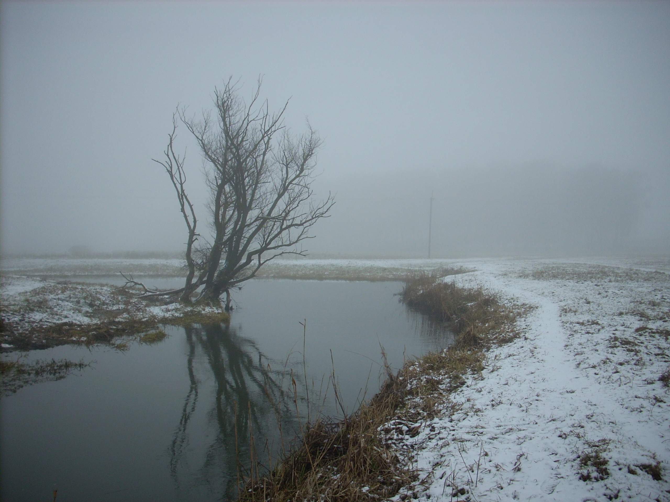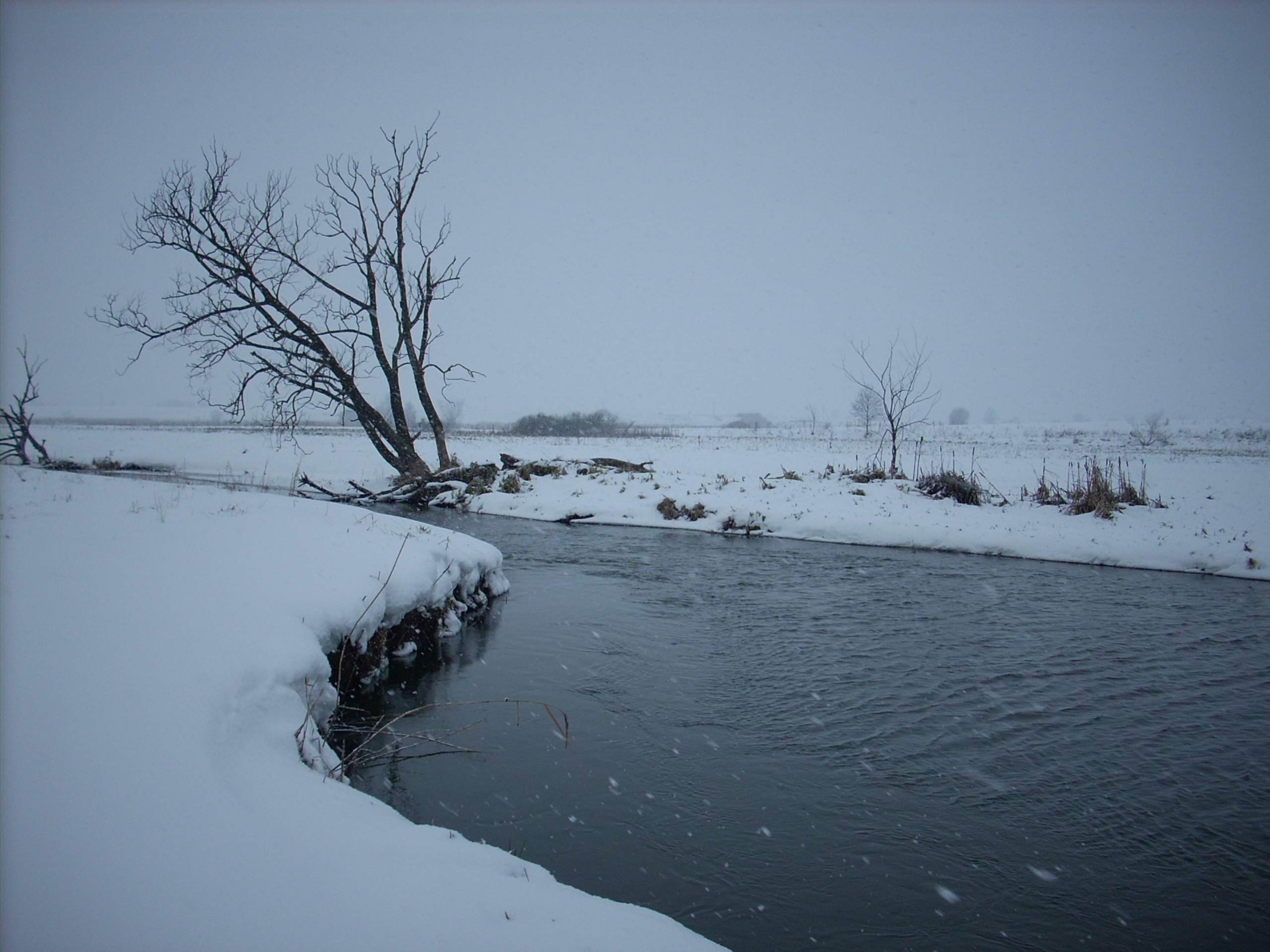 Вийшов на річку зранку в 7.15. В 7.30 південний вітерець змінився на західний, у повітрі з`явилися перші сніжинки (я якраз збирав спінінг), а коли почав ловити то сипало вже конкретно. Ходити важко, місцями снігу по коліно. В одному місці провалився в заметену снігом боброву яму, треба бути обережним. На річці є вже закраїни під берегом, вода несе лід, а місцями утворилися льодяні затори. Луга встає – на радість любителям зимової рибалки; ну а спінінговий сезон напевно закривається.