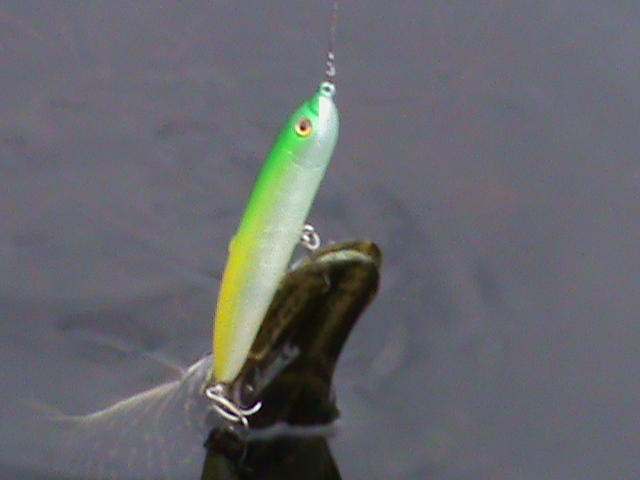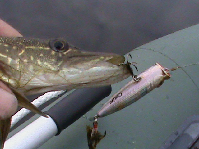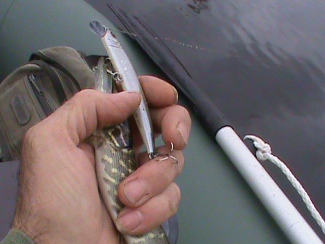 Взял на вертушку "мастер" с 5 граммовой головой. Сначала промахнулся, хотя проводка была и небыстрая. Потом развернулся и таки догнал. Вел себя очень слабо, я думал, что тащу 50-граммового окунька. Уже когда был в руках, крючки выпали.