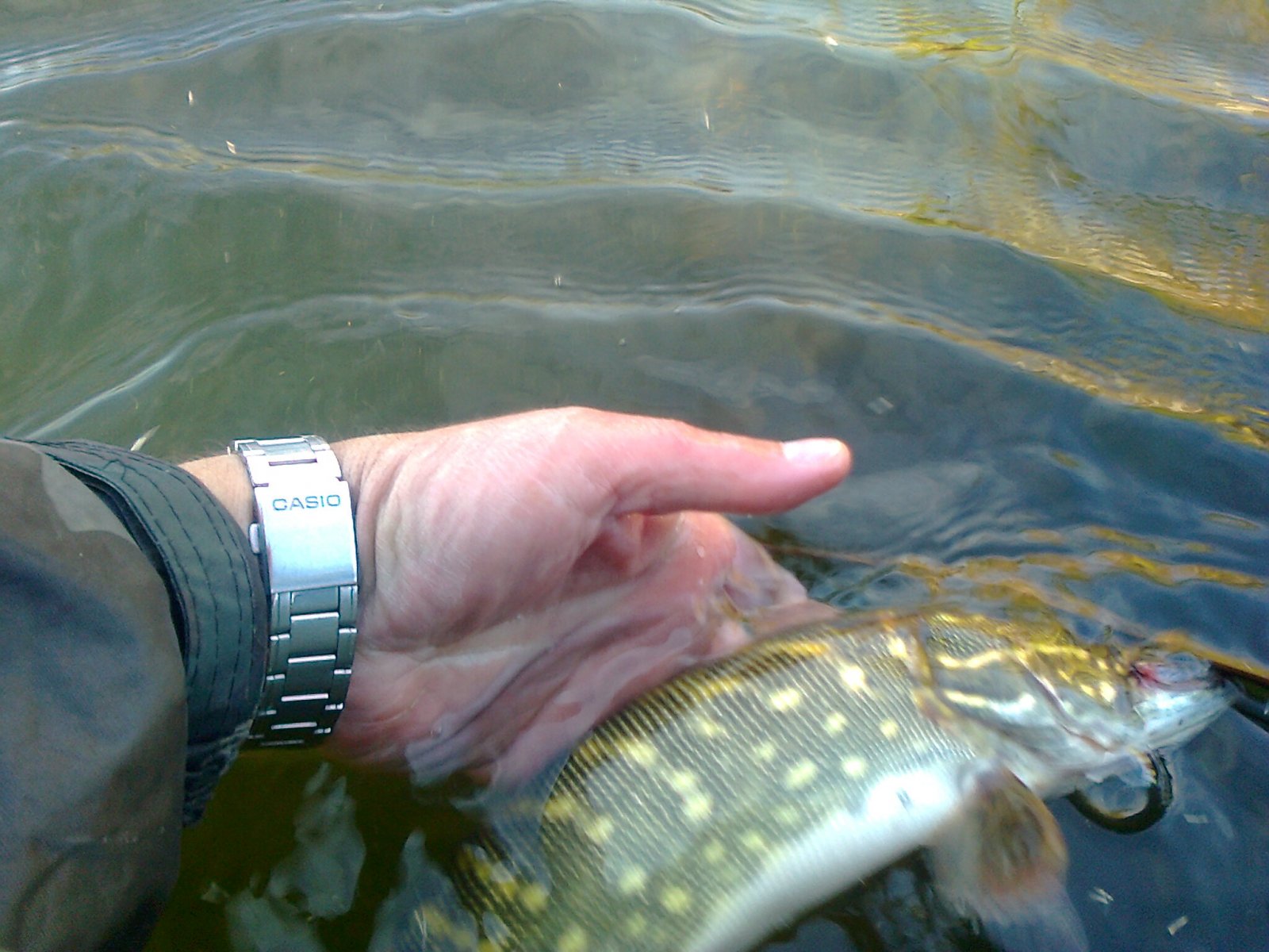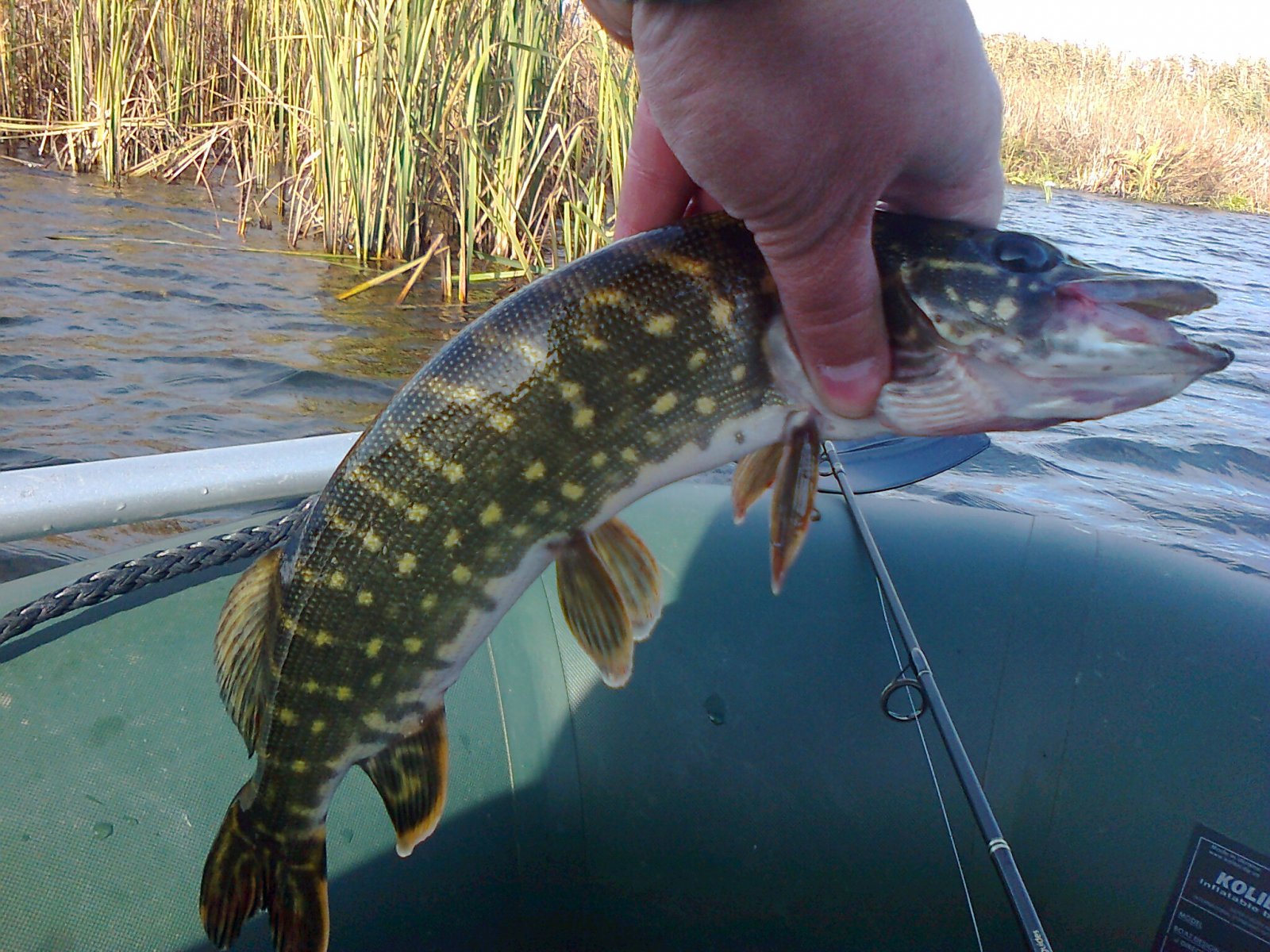 Всю неделю получал сообщения что в Орлик вернулась щука. В субботу получаю официальное подтверждение от Олега и в результате чего с рассвета воскресенья начинаю цедить воду приманками. Вначале пошел по стопам Свояка....ямки, бровки, приямковые участки с водорослями и без них....джиг с подрывом, паузами и без них, подергивание и волочение приманок по дну......смена приманок по типу и цвету.....короче говоря камасутра удалась......НИ-ЧЕ-ГО.....ноль.....ой вру:D два рака соблазнились желтым предатором. Пока занимался извращением лодку потихоньку снесло к камышам, а там смотрю малек фонтаном внутри тросты разлетается. Меняю на воблер....точный заброс и эта торпеда с пяти метров раздвигая камыш нападает на бедный воблер, но промахивается бъет по шнуру и срез:фигасе: ......но воблер стоит плавающий и ярко желтого цвета. Быстро его нахожу, перевязываюсь и вперед в камыши. Вообщем вся рыба охотилась на краю камыша, но только в тех местах где воды было около полутора метров, на более мелких участках во всю свирепствовал окунь. Особо крупных особей не попадалось, но полутора килушных рыб хватало, а мелочи еще больше, после пятнадцатой сбился со счета. Кстати щука вся не травянка, а глубоководная с темным змеиным окрасом и широким телом, очень резвая и сопротивлялась отчаянно. У всех щук желудки были забиты мелкими окунями......у одной насчитал аж пять штук. Две щуки были с большущими язвами. Кстати после общения с профессиональным ихтиологом принял для себя решение таких щук просто отпускать, а не закапывать...... и не нужно закидывать меня шапками......