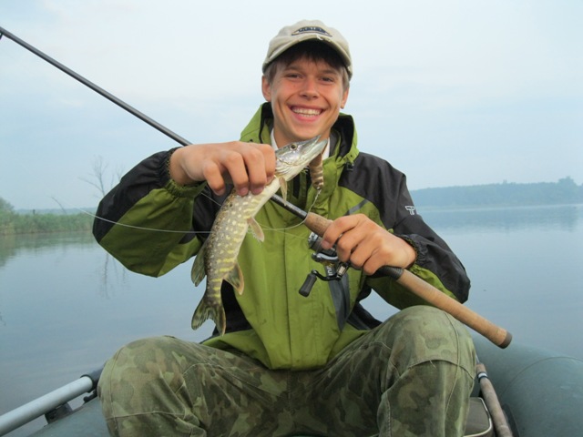 В 5.00 мы уже на воде. Погода была как раз щучья: был ветерок, было не жарко, и были тучки. На первой нашей стоянке у отца зацеп на первом забросе, отцепились и переплыли дальше, на следующей стоянке опять зацеп, отцепились и переплыли еще раз дальше. Ну все, после такого начала рыбу мы должны поймать. И после этих слов на колебалочку я достаю микрощупака.