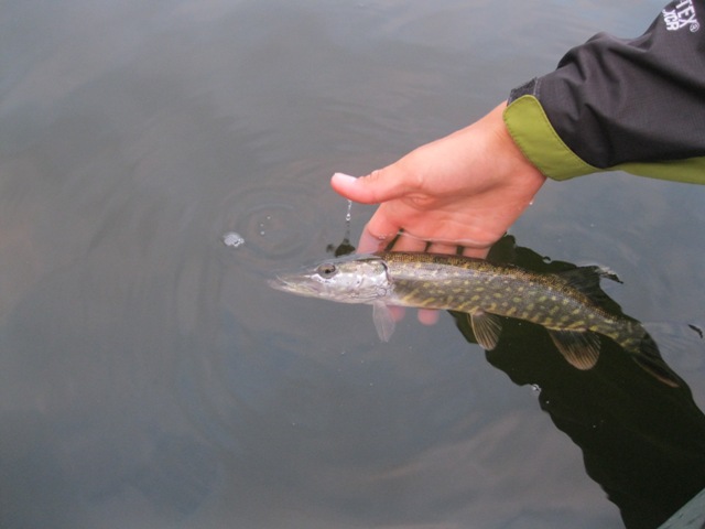 следует поклевка. Ну наконец-то хоть один щупак клюнул. Который после удачной хирургии отправился подрастать!!! Думали, что у рыбы из-за погоды сбился биоритм дня, и она будет клевать в обед, но не тут-то было! Где-то в два часа дня стал моросить дождик, который стал перерастать в дождь и мы начали выплывать.