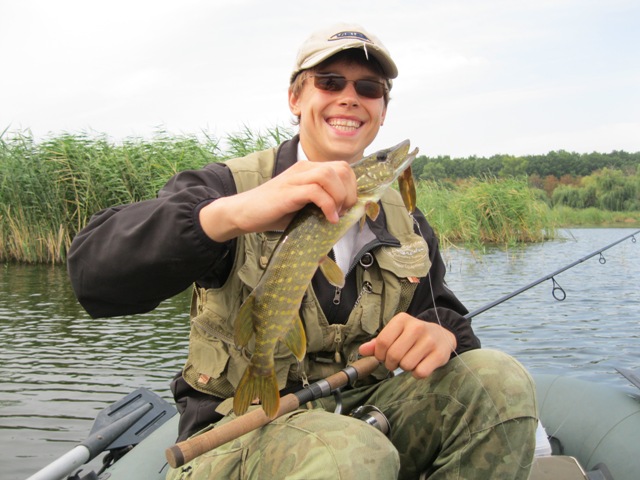 В 6.00 рыба начала гулять, и клев был просто изумительный. Переплывая с места на место, я тролил на весломоторе "Батько". Проплывши где-то метров 300 не было ни одной поклевки. Я в то момент сказал: "Что-то сегодня на трлинг клевать не хочет". И после этих слов сразу же клюет щупак грамм на 600. Пока плавали, то нашли красивое место и по всей теории там должна стоять щука. На первом забросе отец достает щуку, пока я ее выпутывал из подсака у отца еще одна клюет. Пришлось доставать эту щуку с еще одной щукой в подсаке. Мы дальше стоим на этом месте. И в 7.30 утра мне улыбается удача: на первых оборотах катушки мою блесну атакует монстр. Первые мои слова, что я тогда сказал: "Папа, "мамка"". :somyara:Если честно, то я не помню, сколько я ее вываживал- мозги сразу же переключились на эту щуку. Помню лишь то, как она хватанула приманку, как уходила от лодки и то, что лишь с третьего раза отцу удалось завести ее в подсаку. Эмоциям не было предела, а ощущения после такого вываживания были вообще суперскими: руки и ноги дрожали, и зуб на зуб не попадал.:D Передохнув с полчаса, я стал ловить дальше. Щука поклевывала не крупная, максимум до 1 кг. Клевала исключительно на колебалки. Клев продолжался до 9 часов, а потом вообще прекратился. Проплававши еще три часа, и поймав еще по две щучки каждый, мы выплыли. У купающихся отвисла нижняя челюсть,:фигасе: когда увидели такого крокодила. Взвешивание показало, что мой монстр потянул на 4,5 кг. еперь у меня еще есть один личный рекорд.:1_0072: