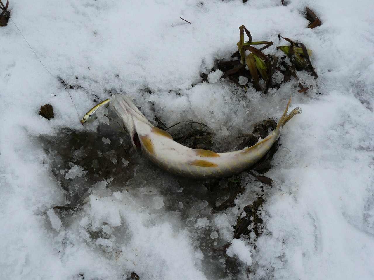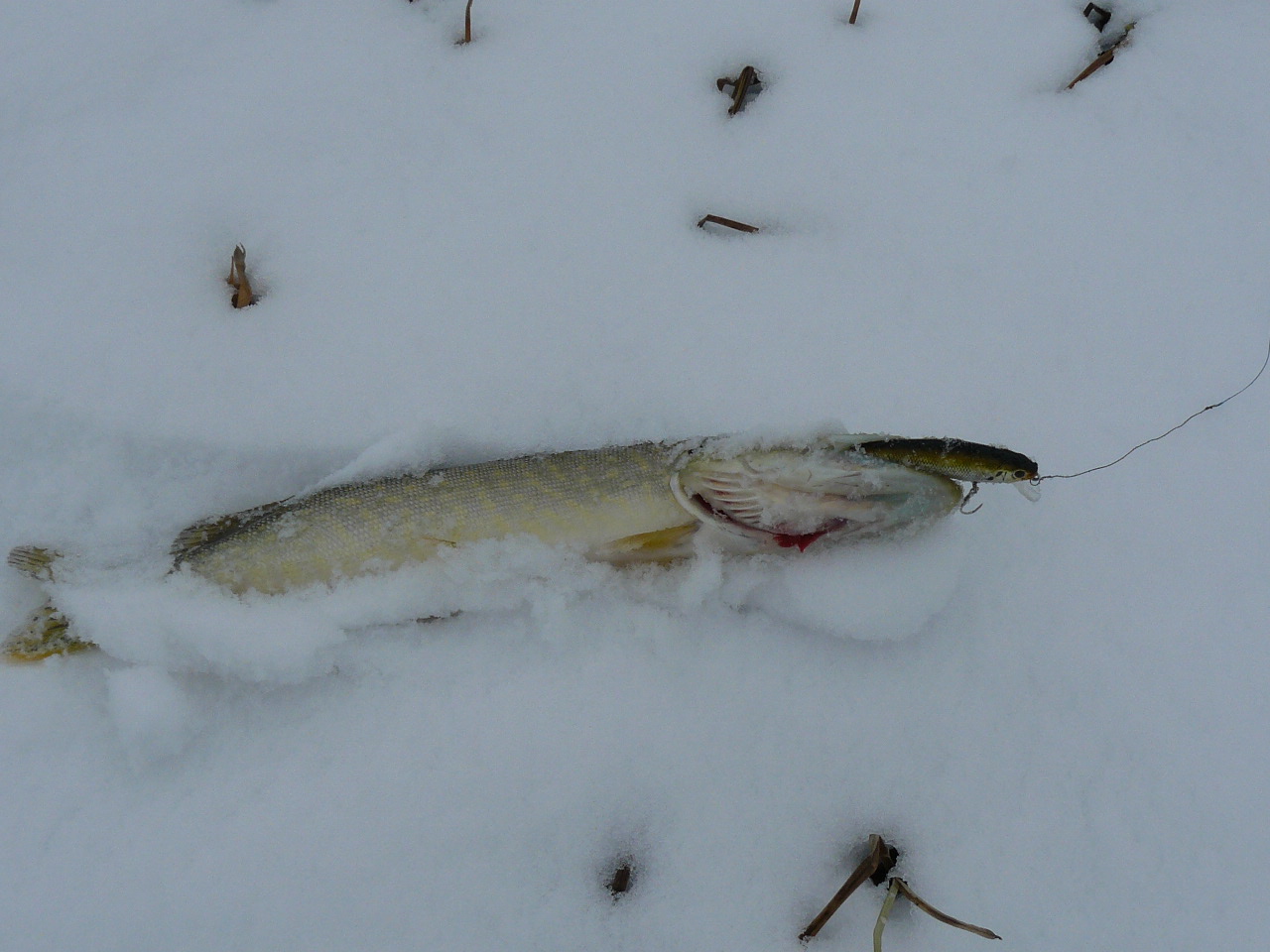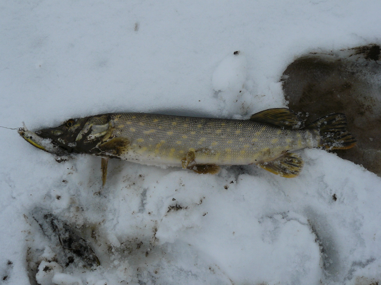 Вже у самому селі бачив кілька сіток, які безсоромно стояли уздовж берегу. Також бачив місцевого спінінгіста, який, як дізнався згодом, і ставив ці сітки. Саме в районі між цими сітками і „висмикав” єдиного на сьогодні щупачка – показано на фото. Запам’ятався той момент тим, що у цю мить гарно проглянуло сонечко і випадав гарний великий сніг. Та хижак на березі – спрацював віброхвіст фірми Relax Kopyto №2 на джигі у 2-3 грами (спина червоного кольору, низ білий із срібними цятками). Проводка – смик із дна із зависаннями у товщі води. Фото щучки із приманкою виставляю. Після фотосесії щучку відпускаю у рідну стихію.